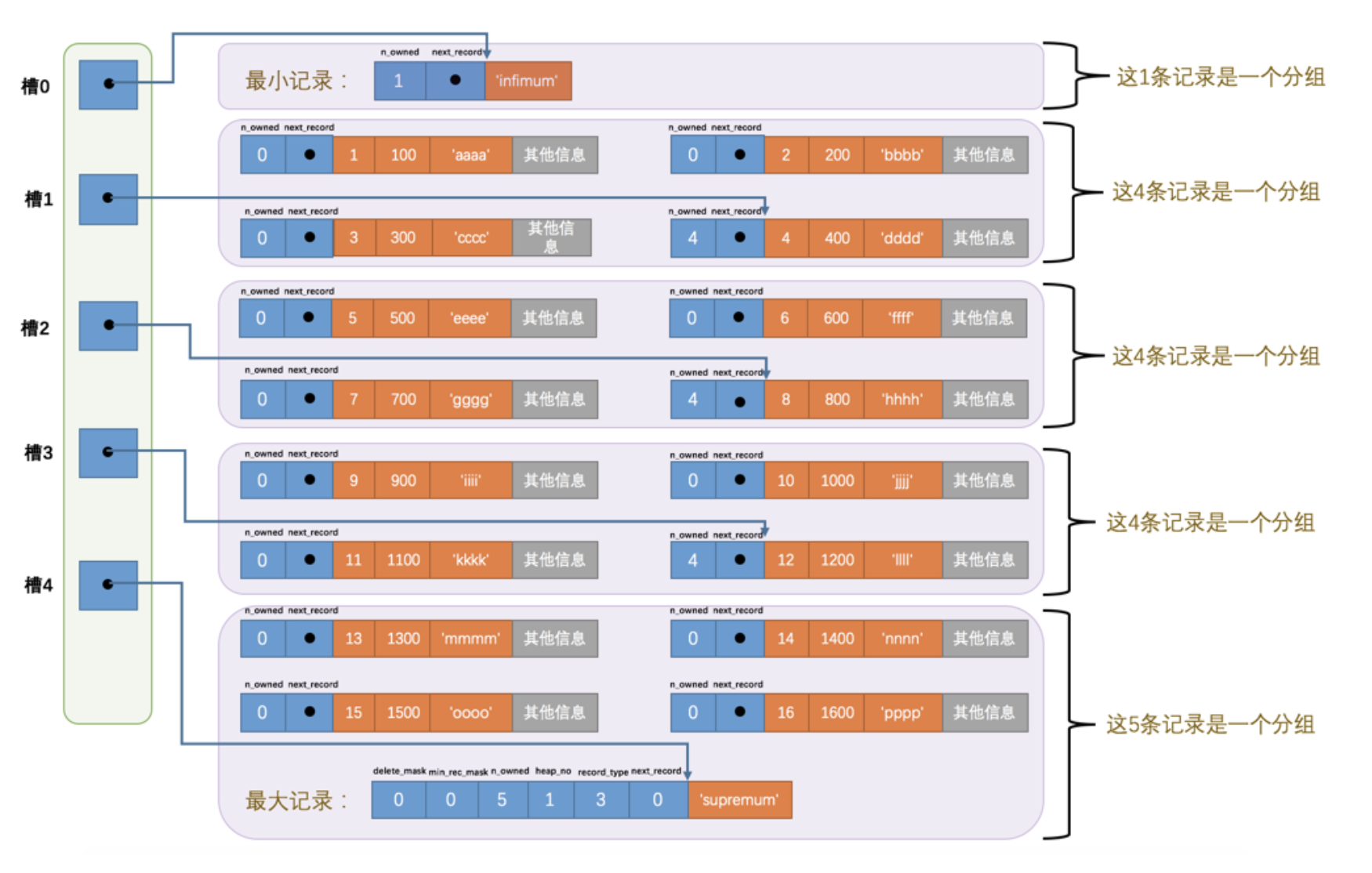 1).将所有正常的记录(包括最大和最小记录,不包括标记为已删除的记录)划分为几个组。2).每个组的最后一条记录(也就是组内最大的那条记录)的头信息中的 n_owned 属性表示该记录拥有多少条记录,也就是该组内共有几条记录。3).将每个组的最后一条记录的地址偏移量单独提取出来按顺序存储到靠近 页 的尾部的地方,这个地方就是所谓的 Page Directory ,也就是 页目录 (此时应该返回头看看页面各个部分的图)。页面目录中的这些地址偏移量被称为 槽 (英文名: Slot ),所以这个页面目录就是由 槽 组成的。