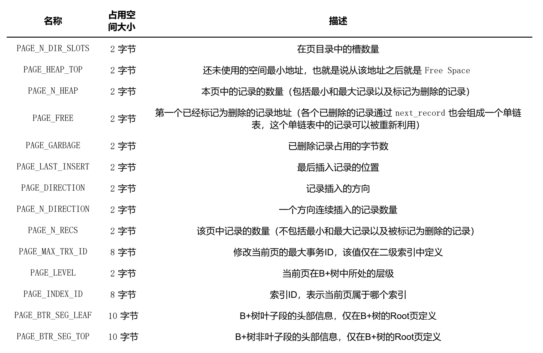 设计 InnoDB 的大叔们为了能得到一个数据页中存储的记录的状态信息,比如本页中已经存储了多少条记录,第一条记录的地址是什么,页目录中存储了多少个槽等等,特意在页中定义了一个叫 Page Header 的部分,它是页 结构的第二部分,这个部分占用固定的 56 个字节,专门存储各种状态信息,具体各个字节都是干嘛的看下表: