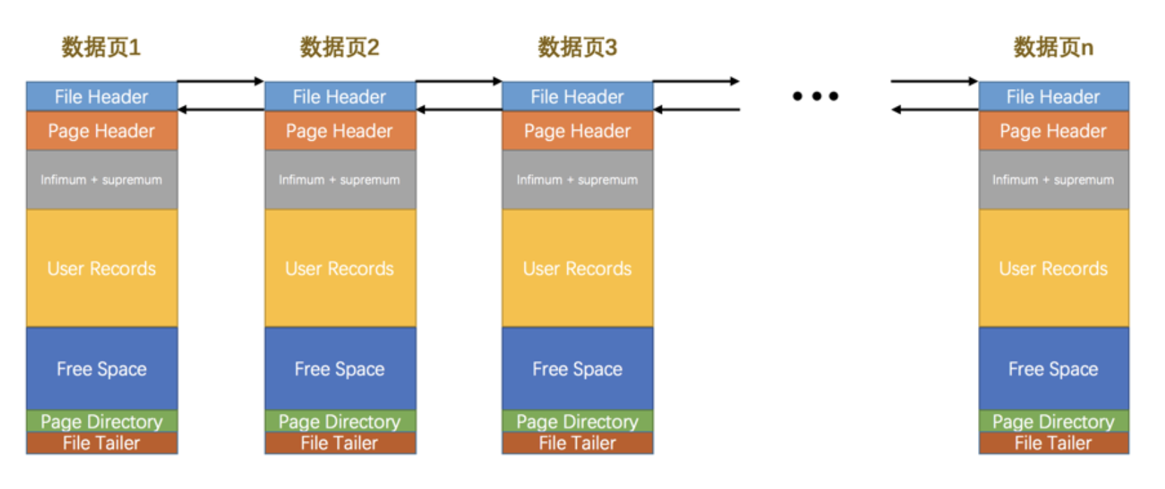 我们前边强调过, InnoDB 都是以页为单位存放数据的,有时候我们存放某种类型的数据占用的空间非常大(比方说一张表中可以有成千上万条记录), InnoDB 可能不可以一次性为这么多数据分配一个非常大的存储空间,如果分散到多个不连续的页中存储的话需要把这些页关联起来, FIL_PAGE_PREV 和 FIL_PAGE_NEXT就分别代表本页的上一个和下一个页的页号。这样通过建立一个双向链表把许许多多的页就都串联起来了,而无需这些页在物理上真正连着。需要注意的是,并不是所有类型的页都有上一个和下一个页的属性,不过我们本集中唠叨的 数据页 (也就是类型为 FIL_PAGE_INDEX 的页)是有这两个属性的,所以所有的数据页其实是一个双链表,就像这样: