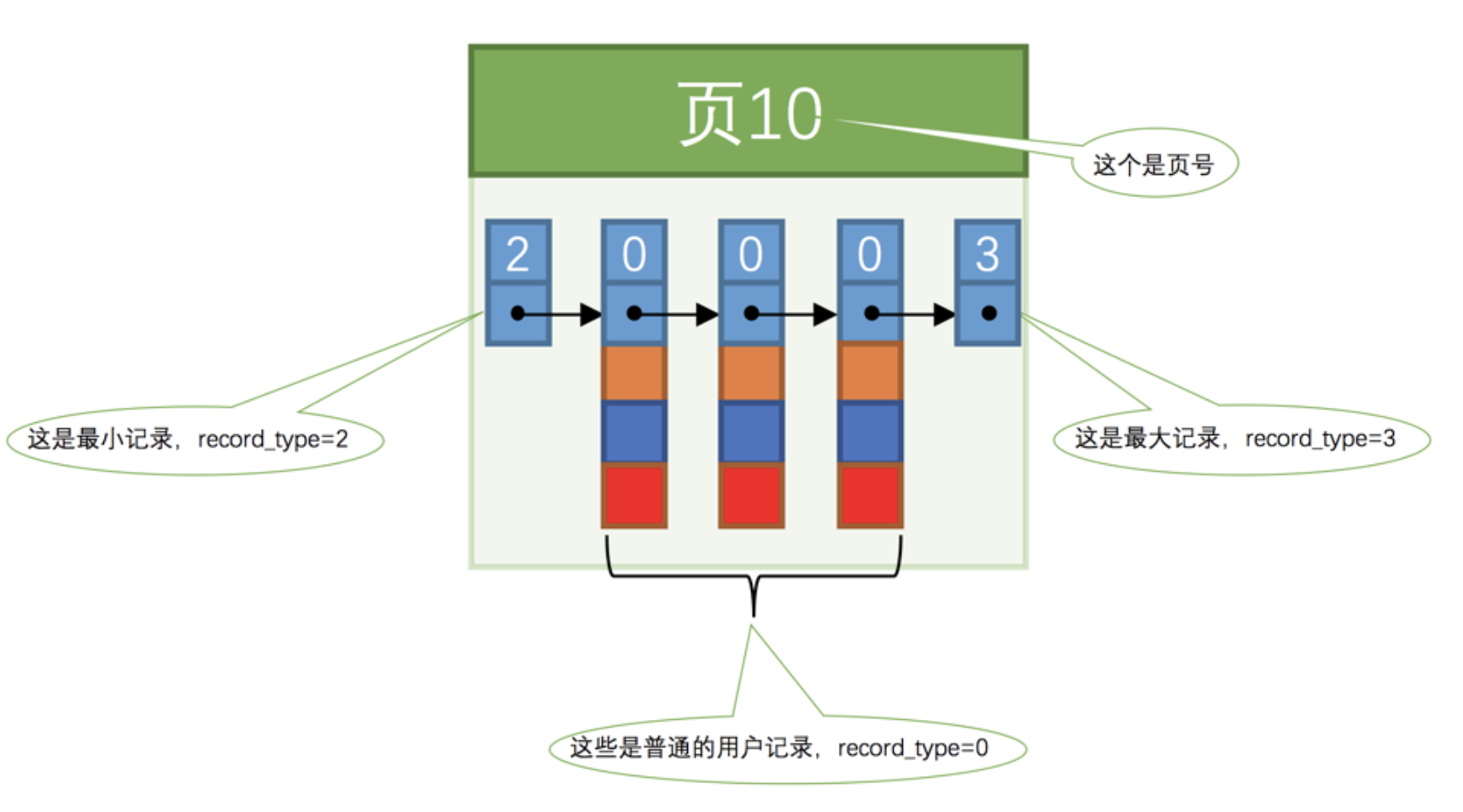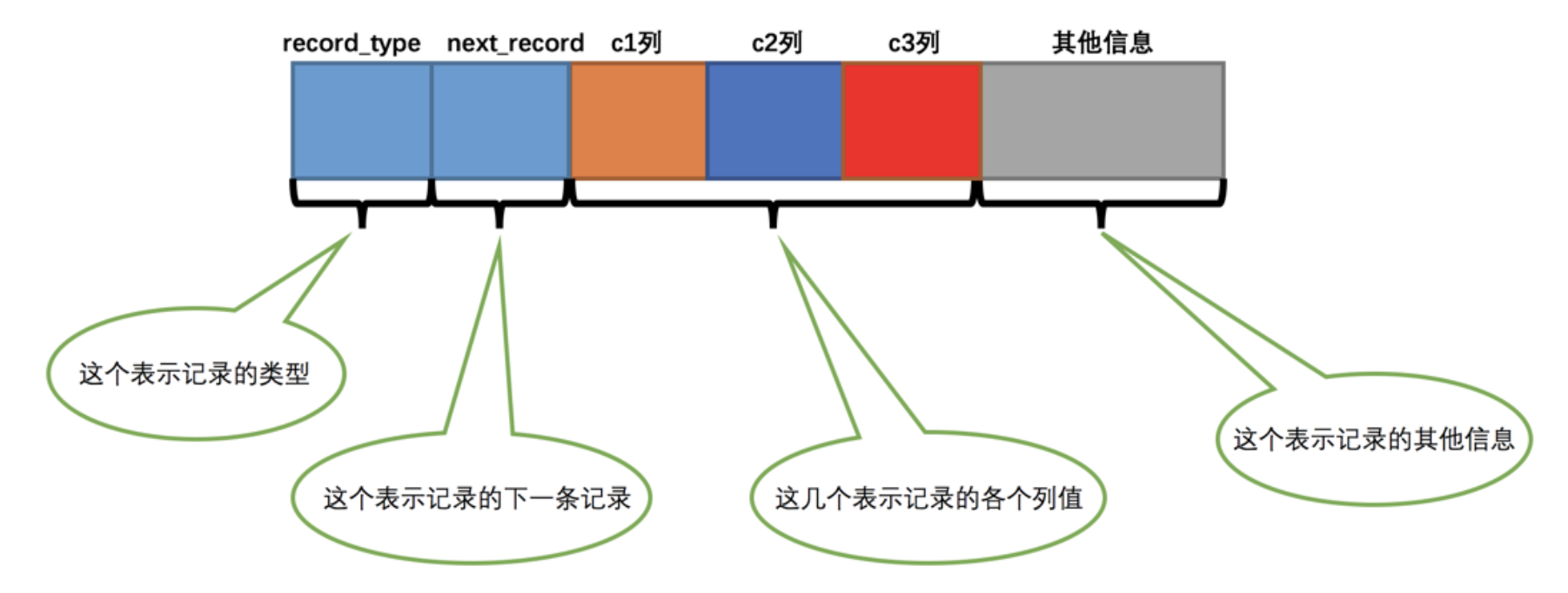 1).record_type:记录头信息的一项属性,表示记录的类型,0 表示普通记录、2 表示最小记录、3 表示最大记录、1 我们还没用过,等会再说~2).next_record:记录头信息的一项属性,表示下一条地址相对于本条记录的地址偏移量,为了方便大家理解,我们都会用箭头来表明下一条记录是谁。3).各个列的值:这里只记录在 index_demo 表中的三个列,分别是 c1 、 c2 和 c3 。4).其他信息:除了上述3种信息以外的所有信息,包括其他隐藏列的值以及记录的额外信息。