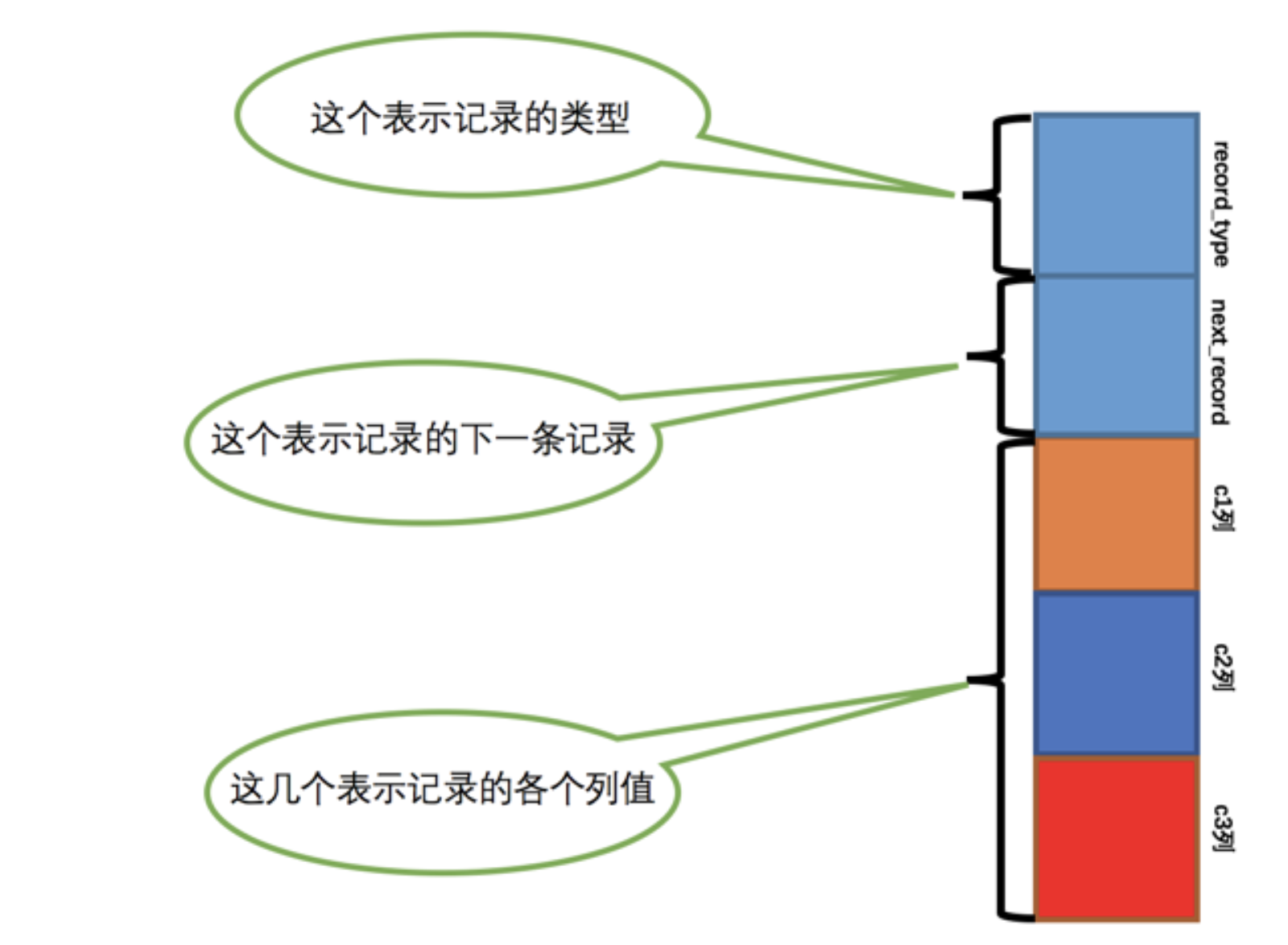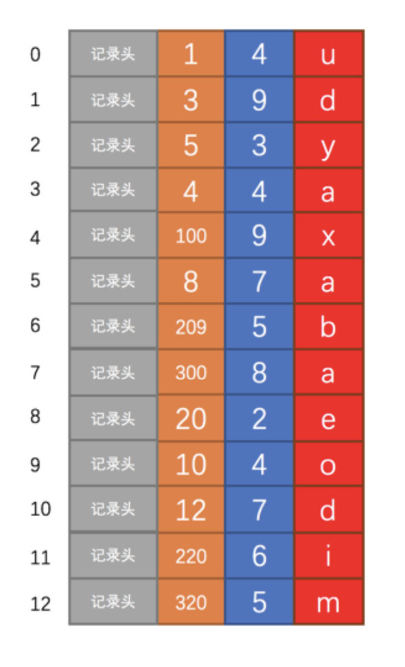 为了节省篇幅,我们之后的示意图中会把记录的 其他信息 这个部分省略掉,因为它占地方并且不会有什么观赏效果。另外,为了方便理解,我们觉得把记录竖着放看起来感觉更好,所以将记录格式示意图的 其他信息 去掉并把它竖起来的效果就是图一这样: