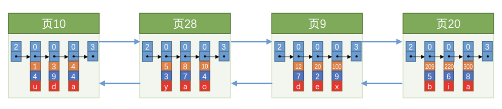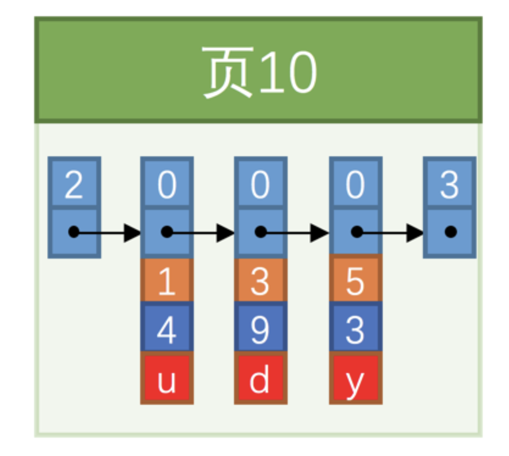 因为 页10 最多只能放3条记录,所以我们不得不再分配一个新页: