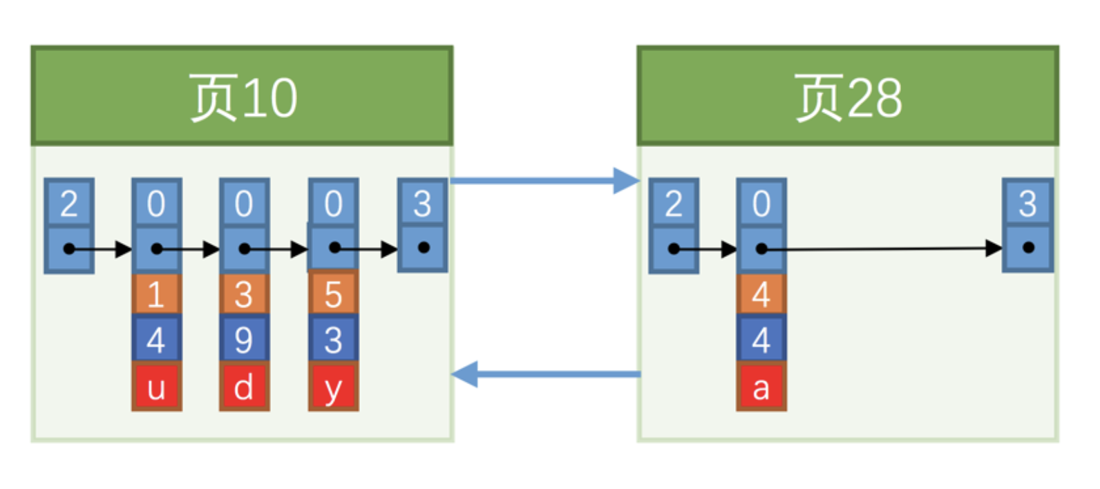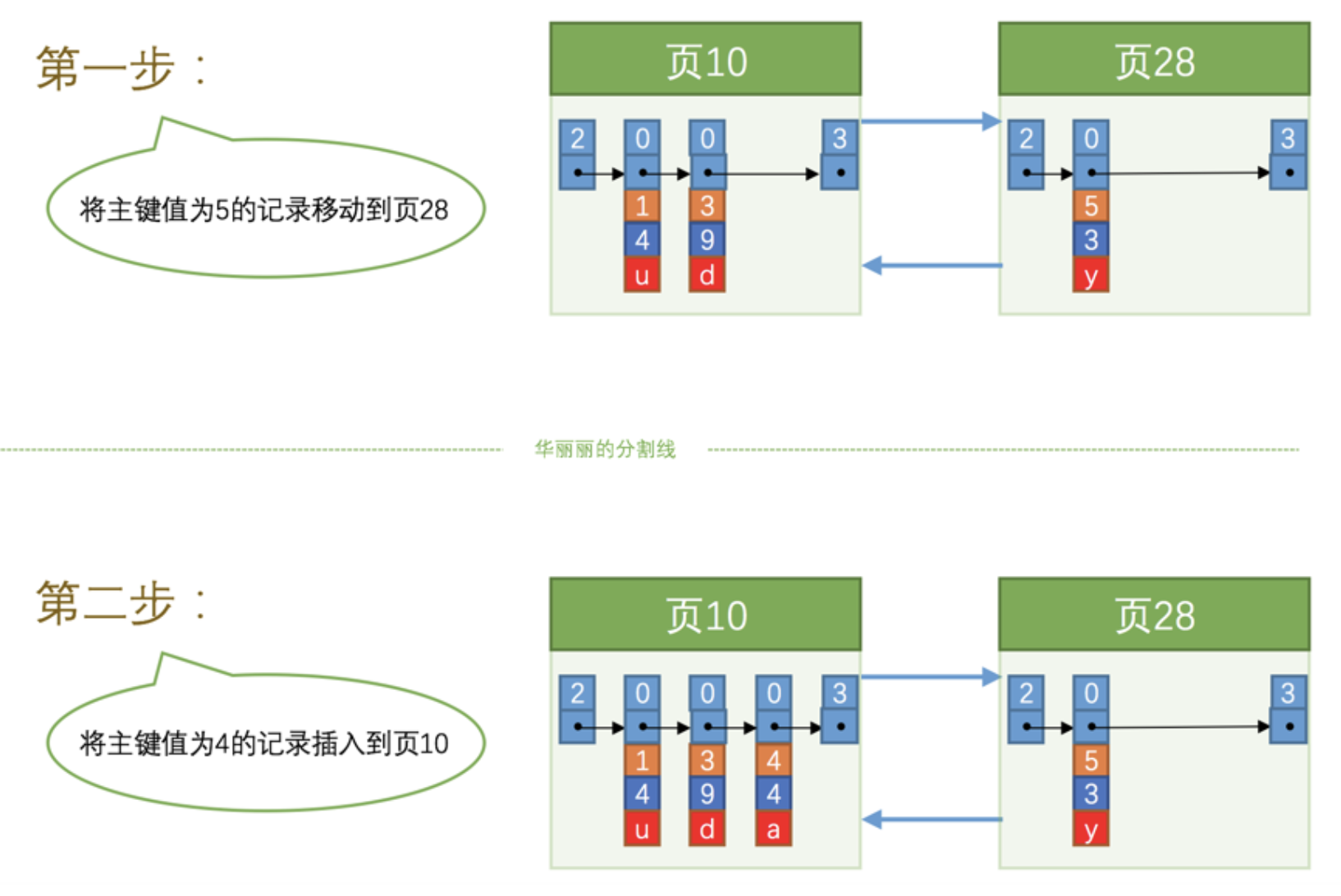 咦?怎么分配的页号是 28 呀,不应该是 11 么?再次强调一遍,新分配的数据页编号可能并不是连续的,也就是说我们使用的这些页在存储空间里可能并不挨着。它们只是通过维护着上一个页和下一个页的编号而建立了链表关系。另外, 页10 中用户记录最大的主键值是 5 ,而 页28 中有一条记录的主键值是 4 ,因为 5 > 4 ,所以这就不符合下一个数据页中用户记录的主键值必须大于上一个页中用户记录的主键值的要求,所以在插入主键值为 4 的记录的时候需要伴随着一次记录移动,也就是把主键值为 5 的记录移动到 页28 中,然后再把主键值为 4 的记录插入到 页10 中,这个过程的示意图如右: