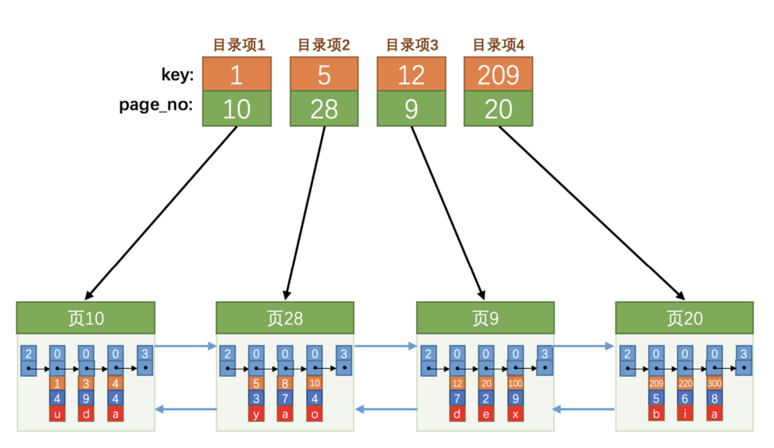 1).: 页的用户记录中最小的主键值,我们用 key 来表示。2).: 页号,我们用 page_no 表示。所以我们为上边几个页做好的目录就像下图这样子: