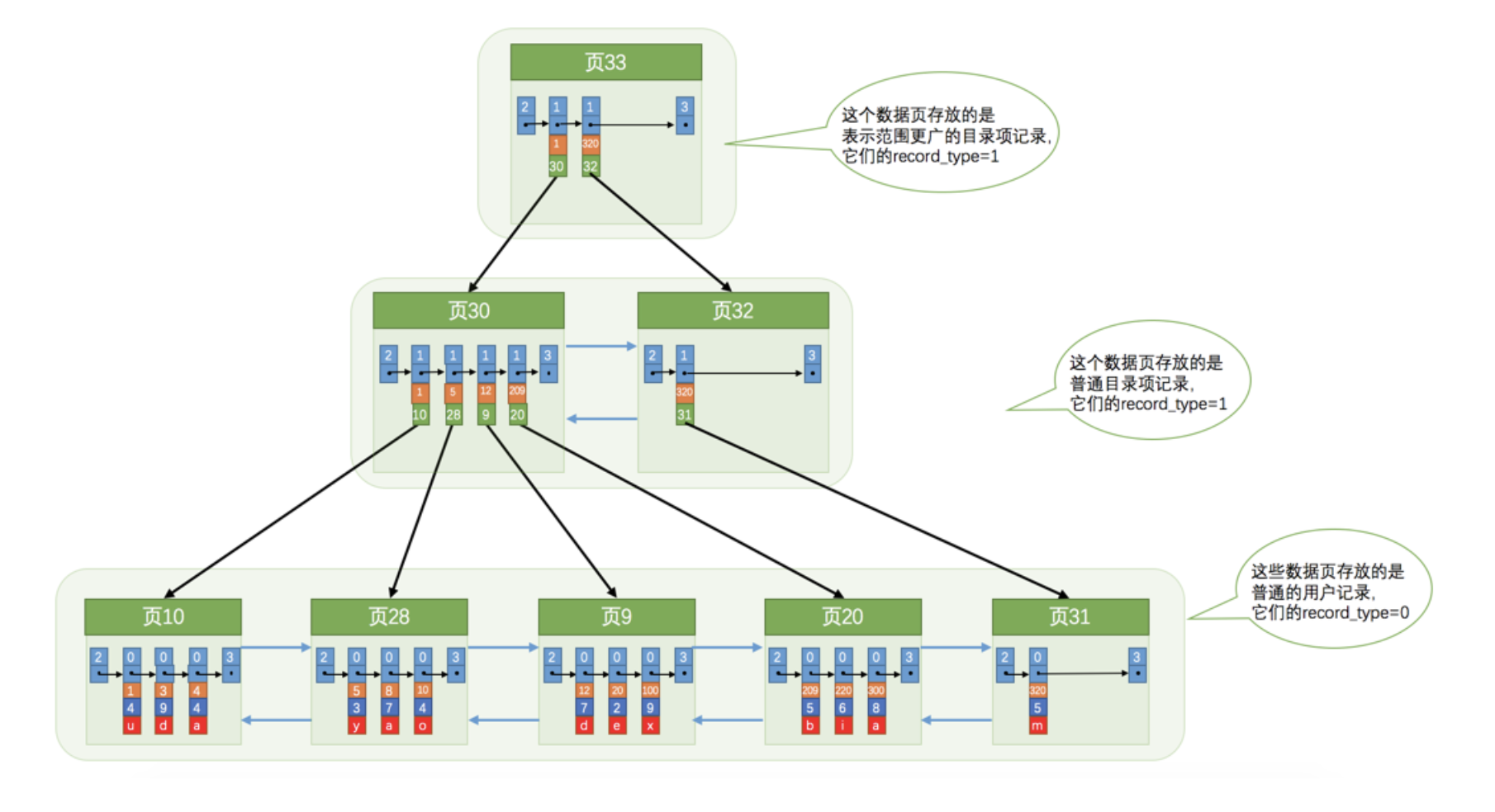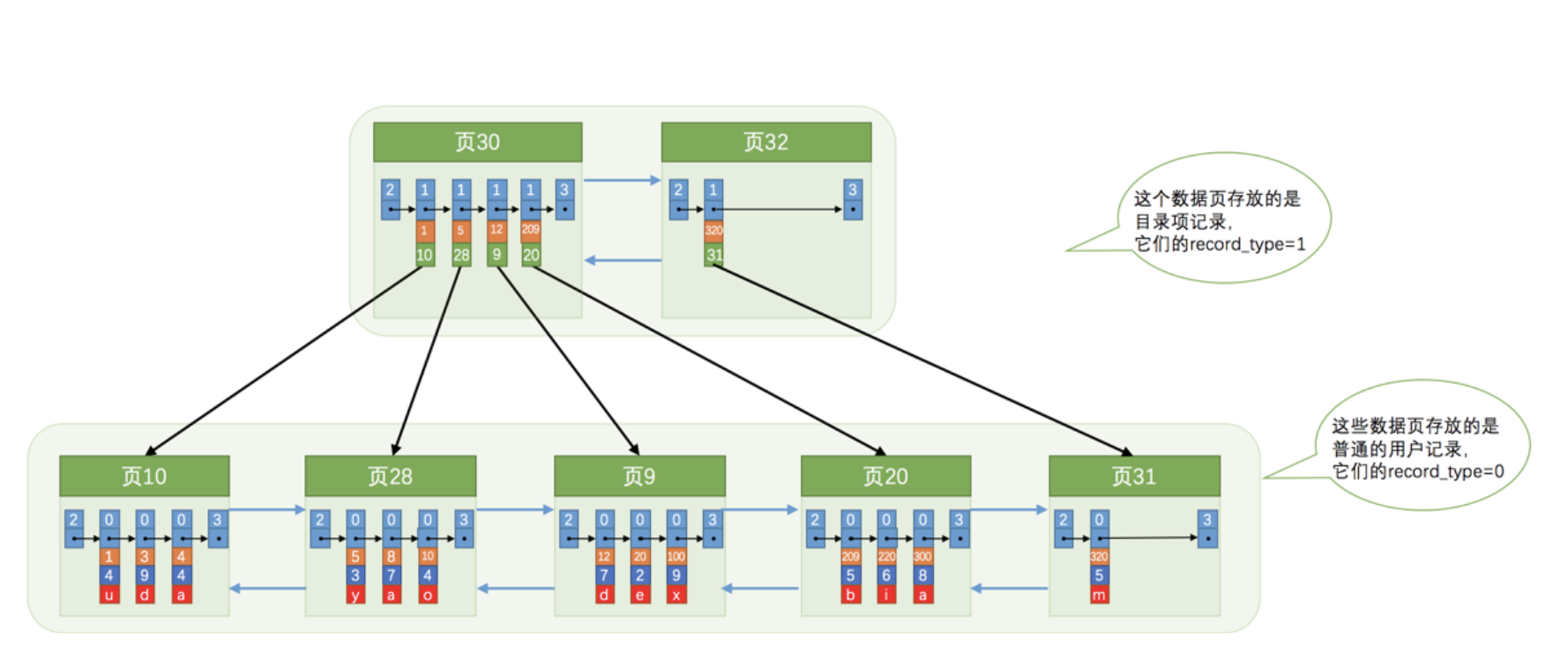 a).为存储该用户记录而新生成了 页31 。b).因为原先存储 目录项记录 的 页30 的容量已满(我们前边假设只能存储4条 目录项记录 ),所以不得不需要一个新的 页32 来存放 页31 对应的目录项。