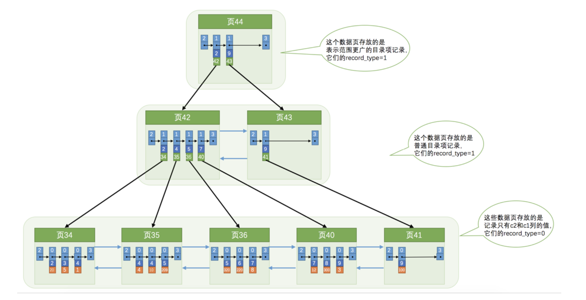 从图中可以看出来,一个 B+ 树的节点其实可以分成好多层,设计 InnoDB 的大叔们为了讨论方便,规定最下边的那层,也就是存放我们用户记录的那层为第 0 层,之后依次往上加。之前的讨论我们做了一个非常极端的假设:存放用户记录的页最多存放3条记录,存放目录项记录的页最多存放4条记录。其实真实环境中一个页存放的记录数量是非常大的,假设,假设,假设所有存放用户记录的叶子节点代表的数据页可以存放100条用户记录,所有存放目录项记录的内节点代表的数据页可以存放1000条目录项记录,那么:
