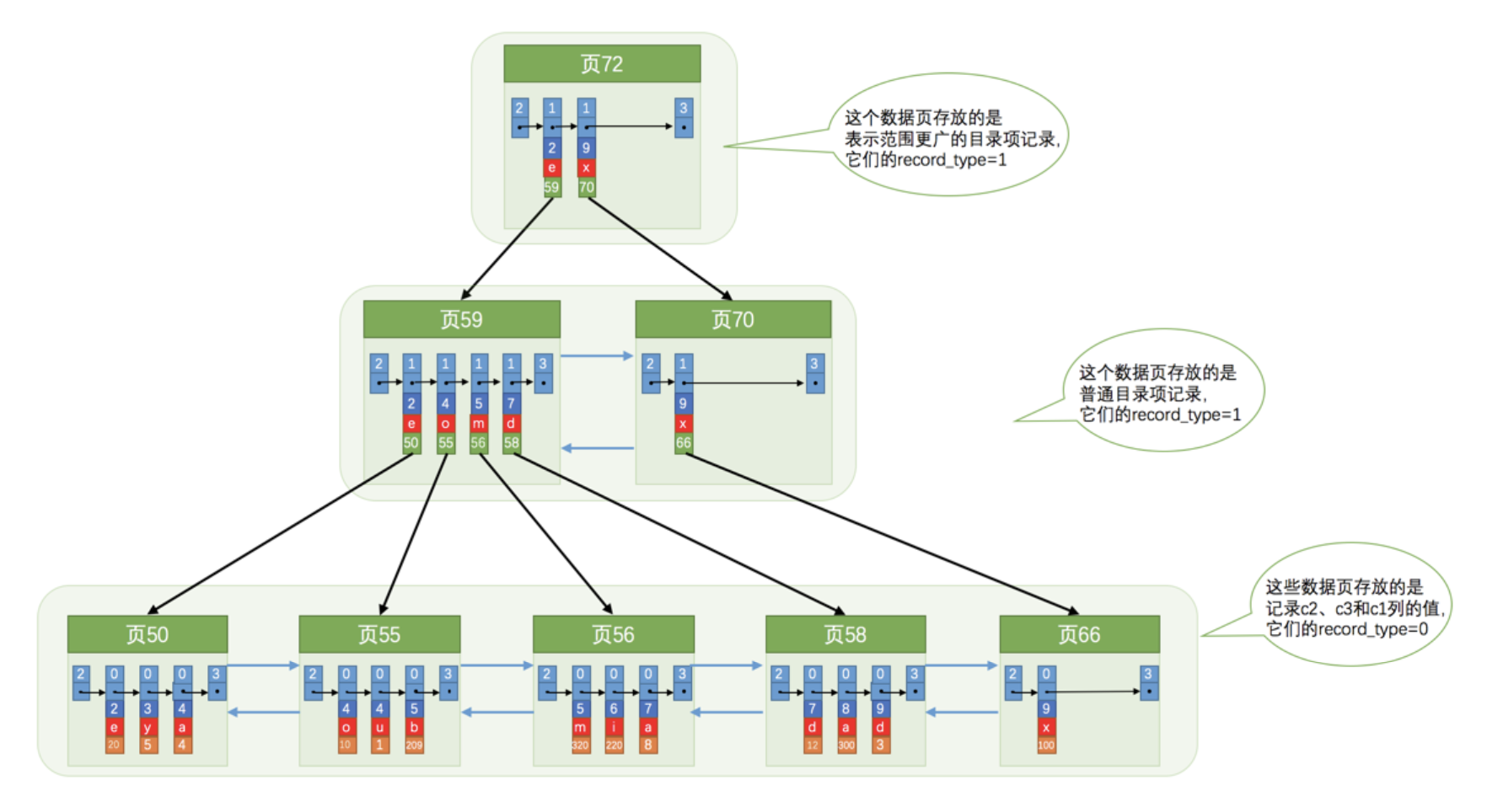 1).使用记录主键值的大小进行记录和页的排序,这包括三个方面的含义: