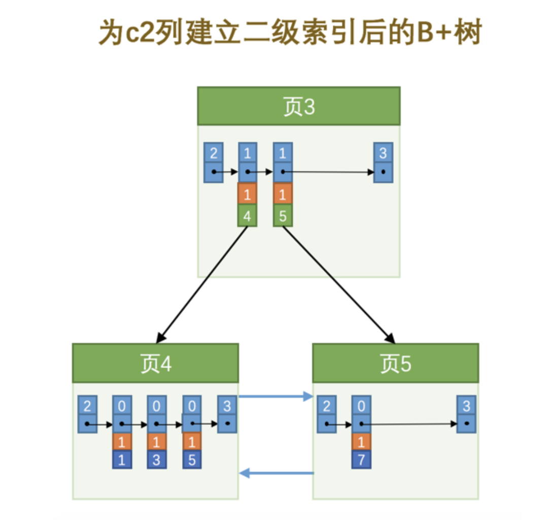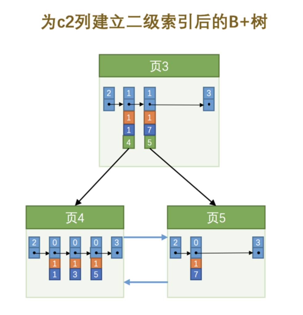 也就是我们把 主键值 也添加到二级索引内节点中的目录项记录了,这样就能保证 B+ 树每一层节点中各条目录项记录除 页号 这个字段外是唯一的,所以我们为 c2 列建立二级索引后的示意图实际上应该是这样子的: