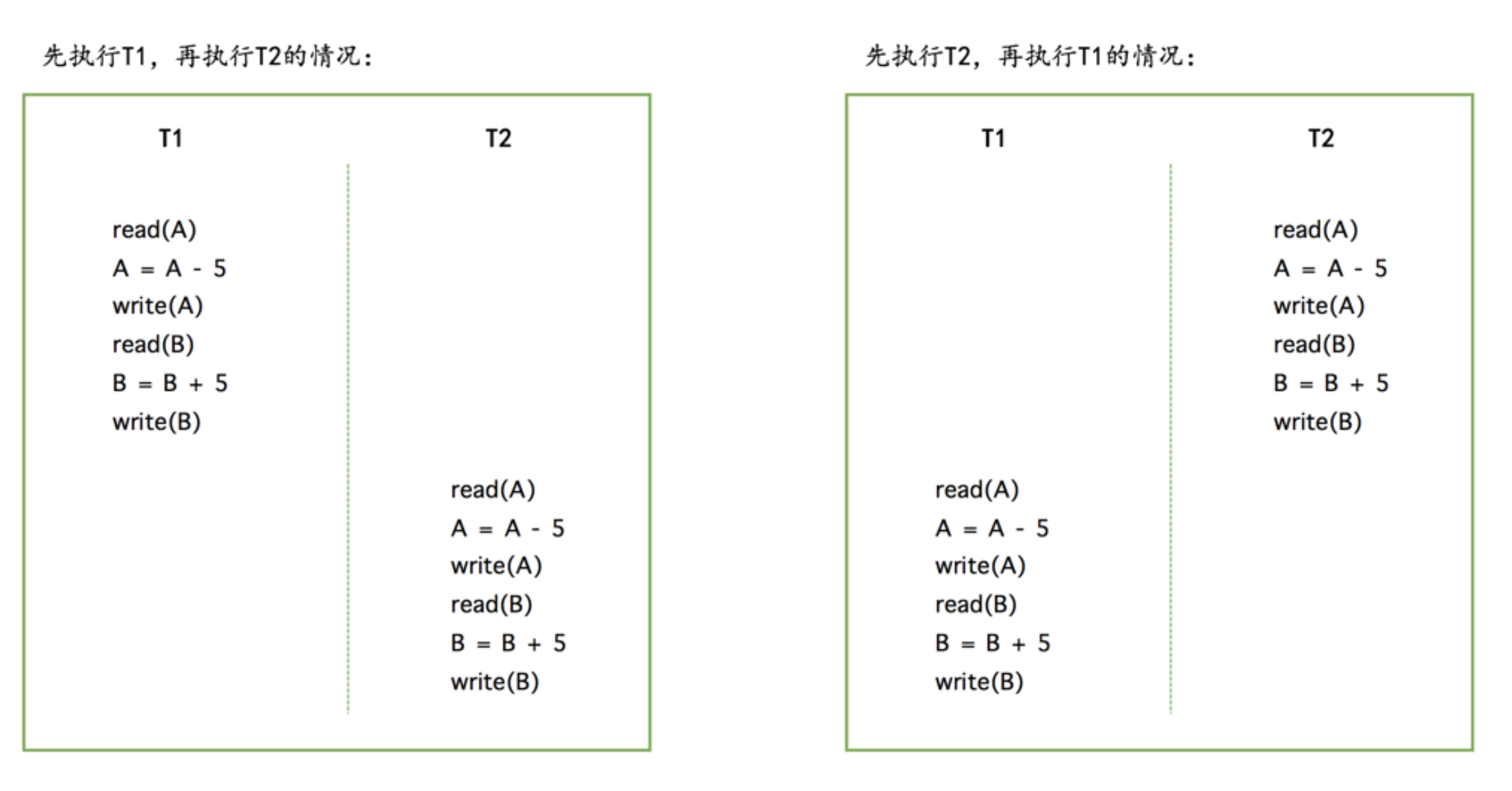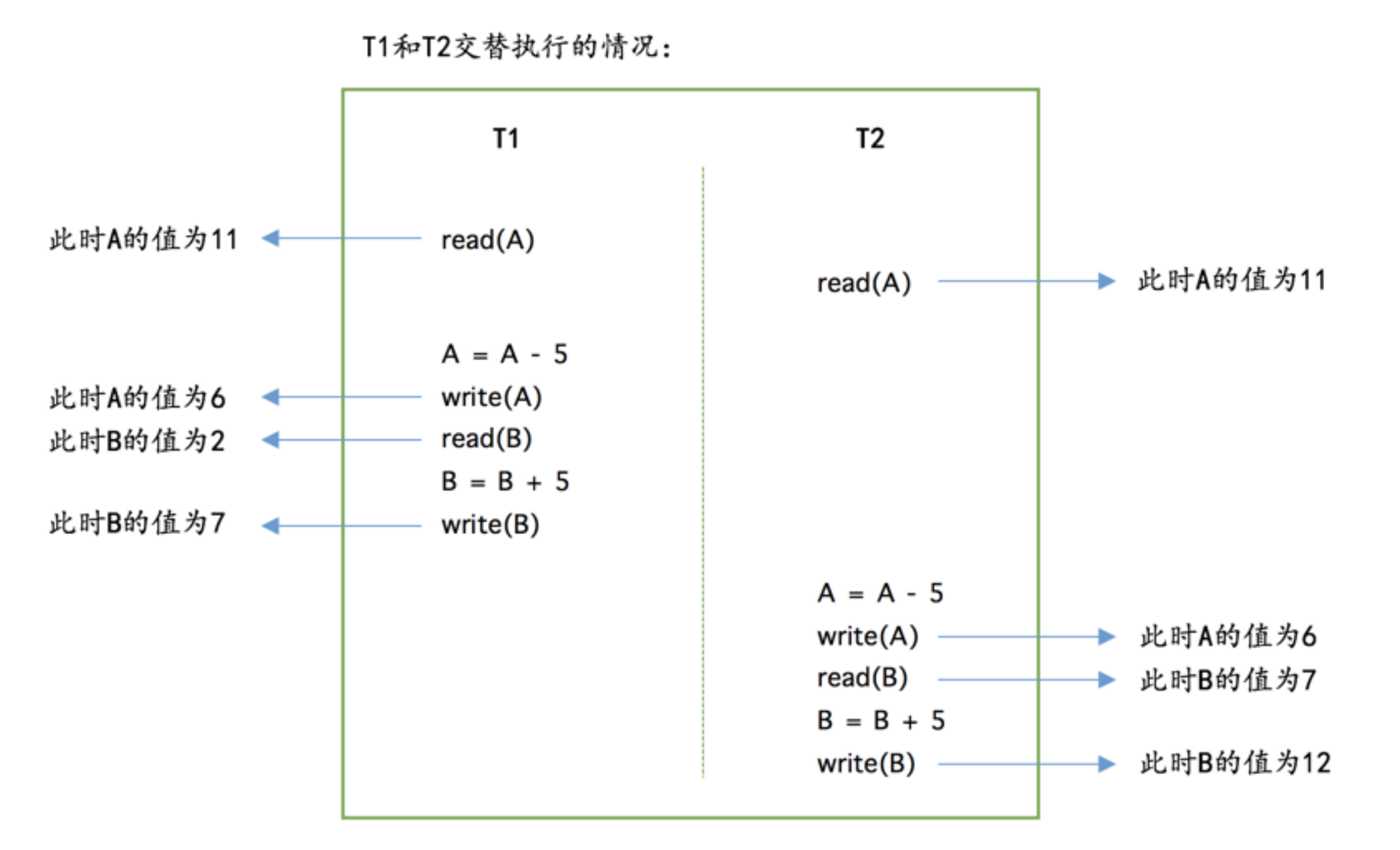 但是很不幸,真实的数据库中 T1 和 T2 的操作可能交替执行,比如这样: