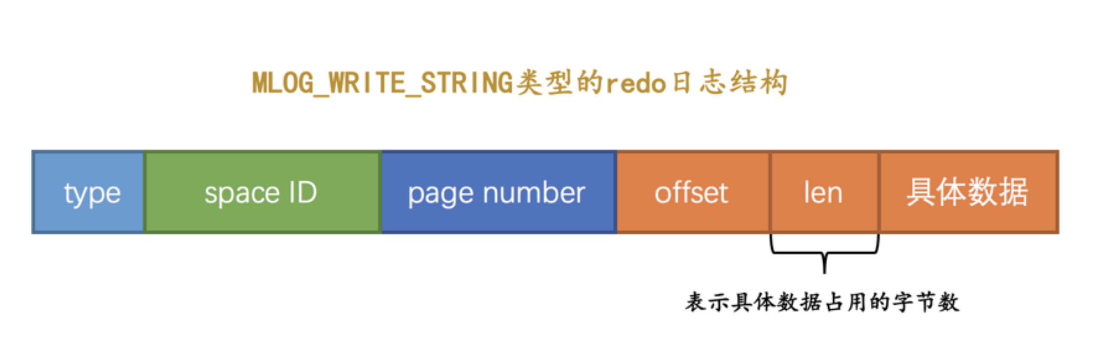 其余 MLOG_1BYTE 、 MLOG_2BYTE 、 MLOG_4BYTE 类型的 redo 日志结构和 MLOG_8BYTE 的类似,只不过具体数据中包含对应个字节的数据罢了。 MLOG_WRITE_STRING 类型的 redo 日志表示写入一串数据,但是因为不能确定写入的具体数据占用多少字节,所以需要在日志结构中添加一个 len 字段: