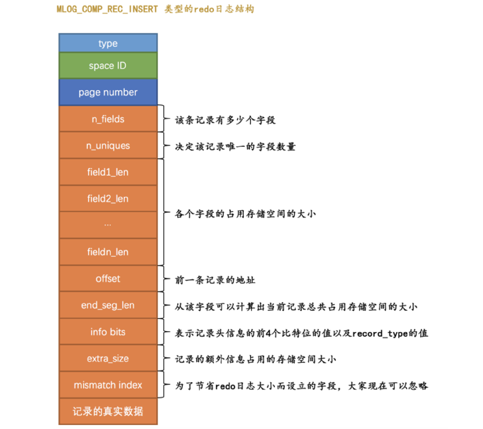 这个类型为 MLOG_COMP_REC_INSERT 的 redo 日志结构有几个地方需要大家注意: