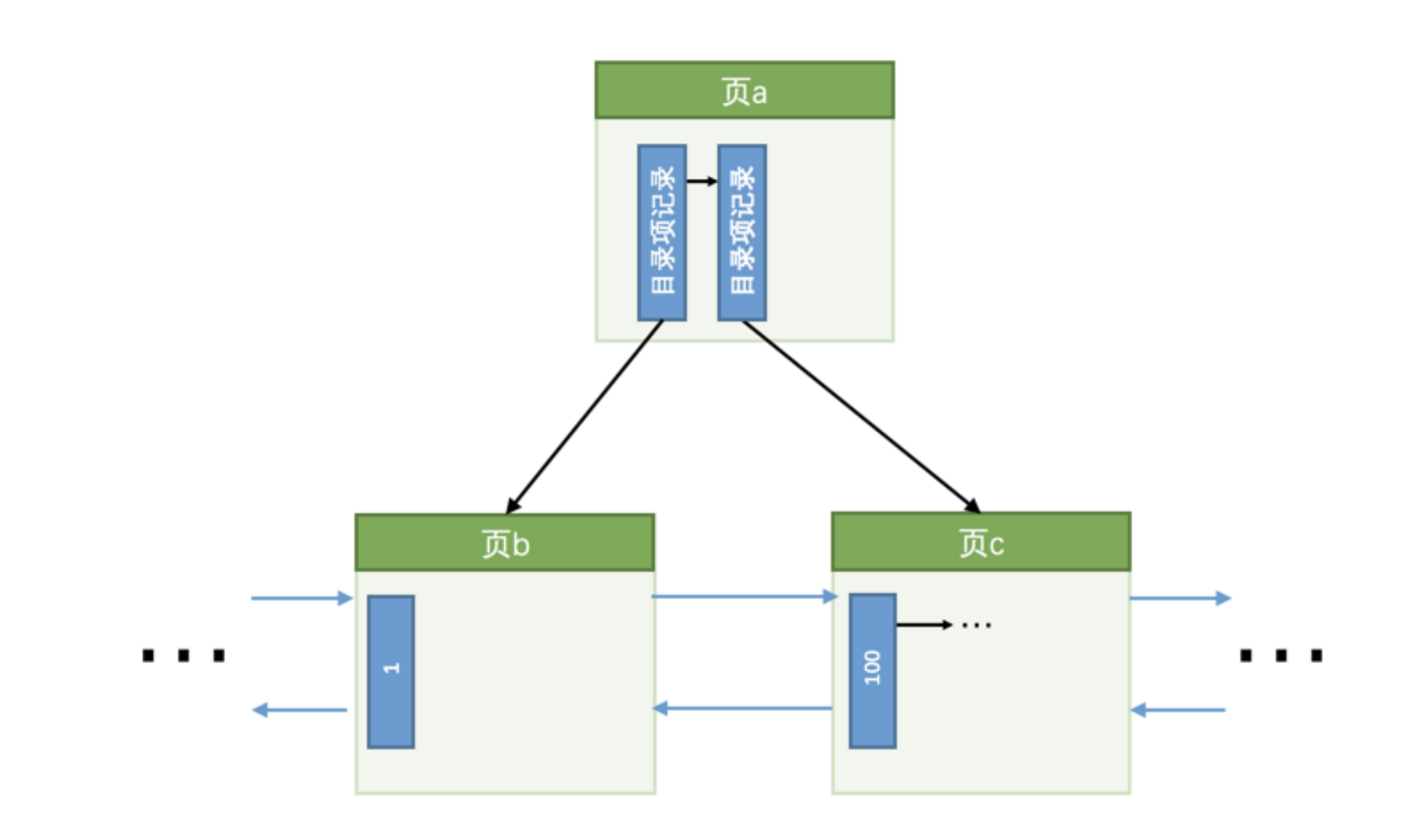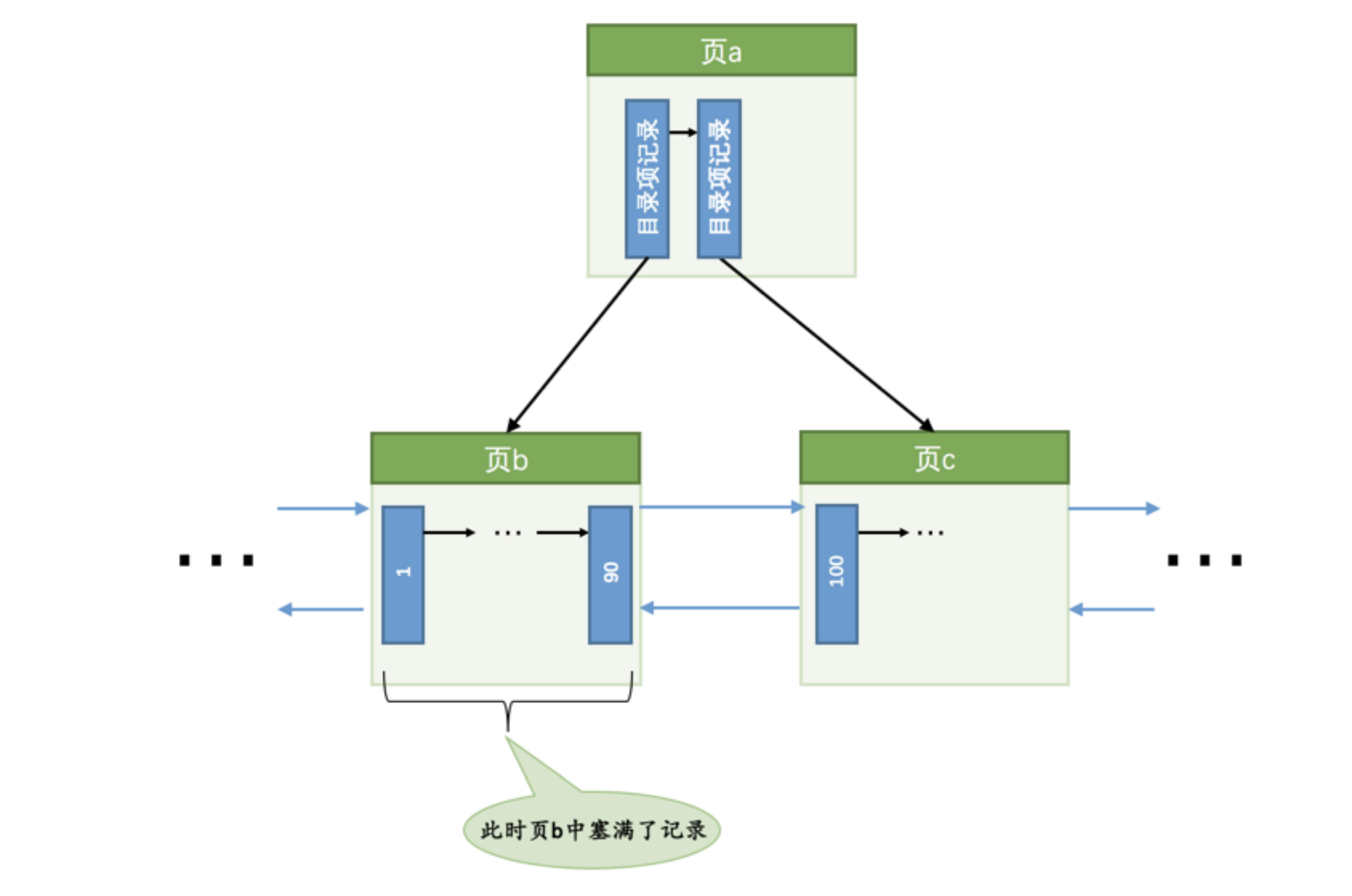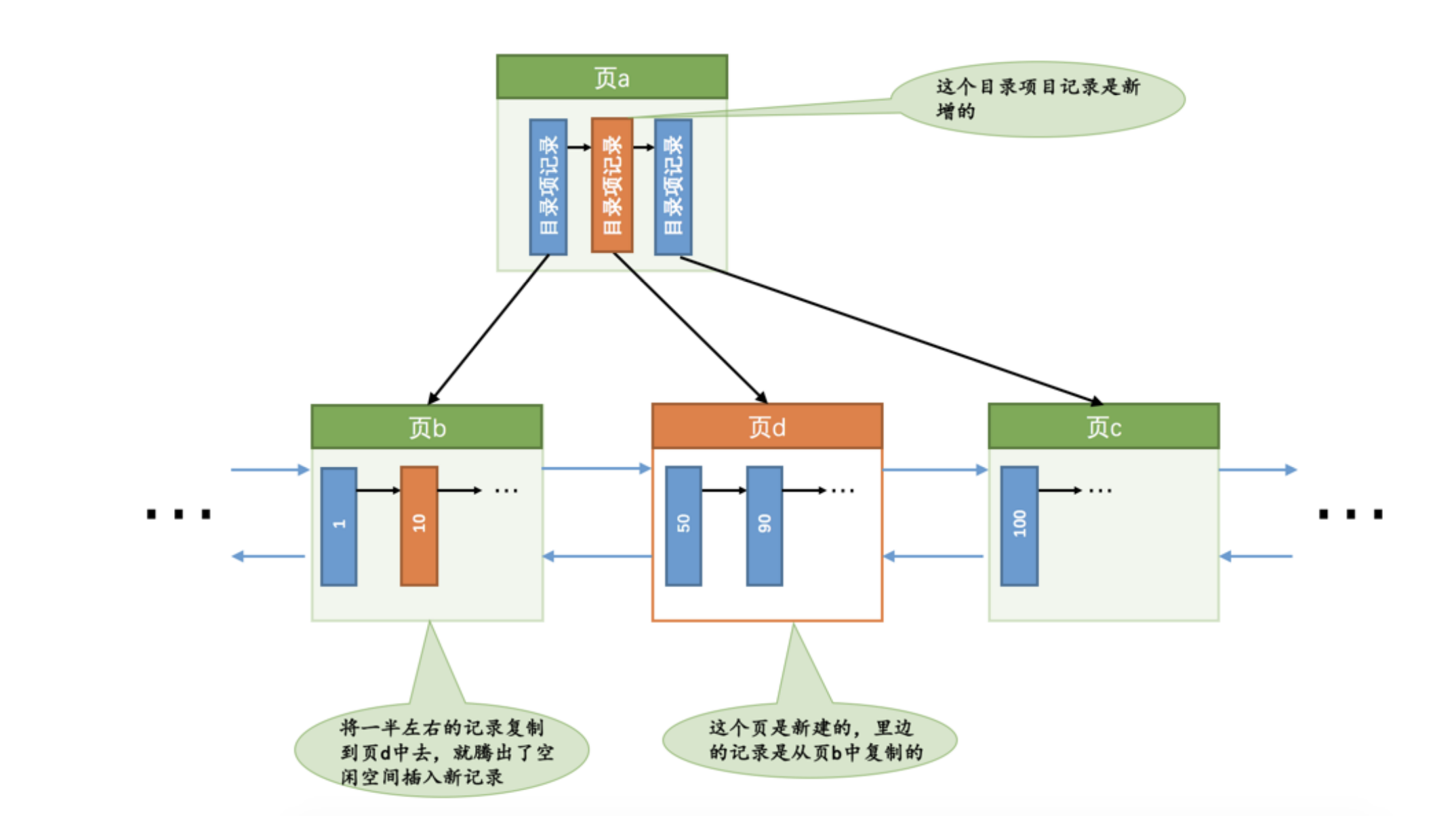 现在我们要插入一条键值为 10 的记录,很显然需要被插入到 页b 中,但是从图中也可以看出来,此时 页b 已经塞满了记录,没有更多的空闲空间来容纳这条新记录了,所以我们需要进行页面的分裂操作,就像这样: