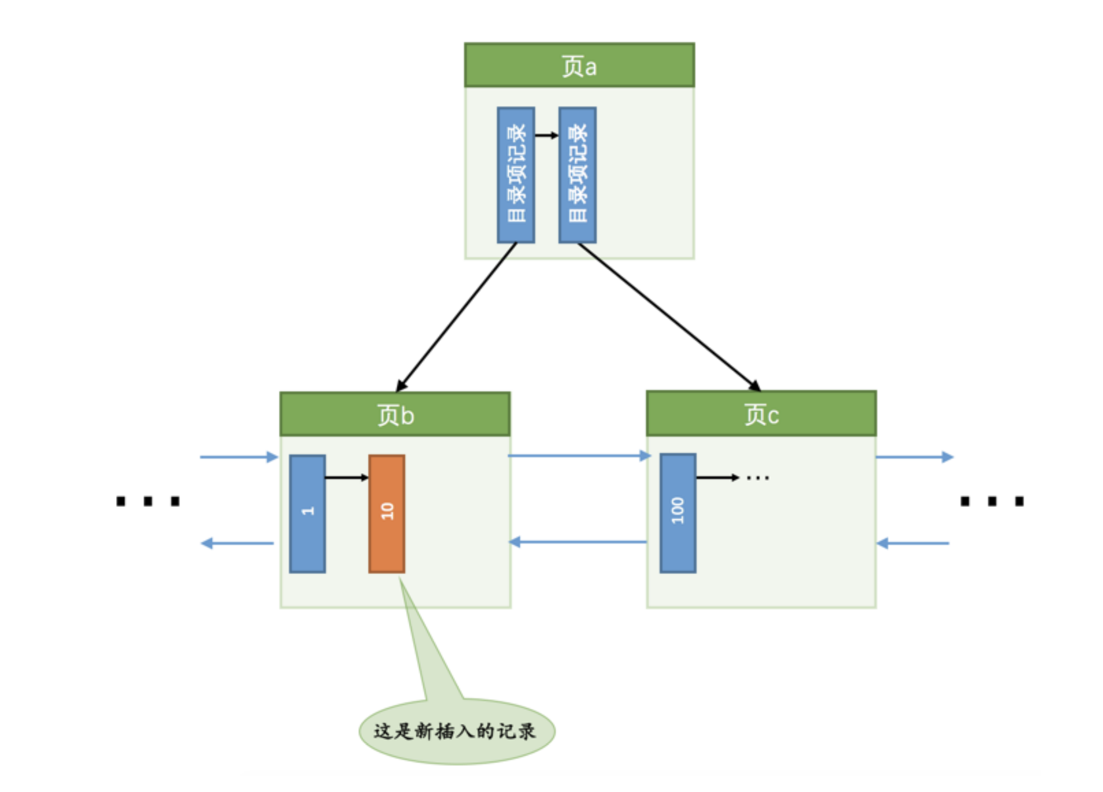 现在我们要插入一条键值为 10 的记录,很显然需要被插入到 页b 中,由于 页b 现在有足够的空间容纳一条记录,所以直接将该记录插入到 页b 中就好了,就像这样: