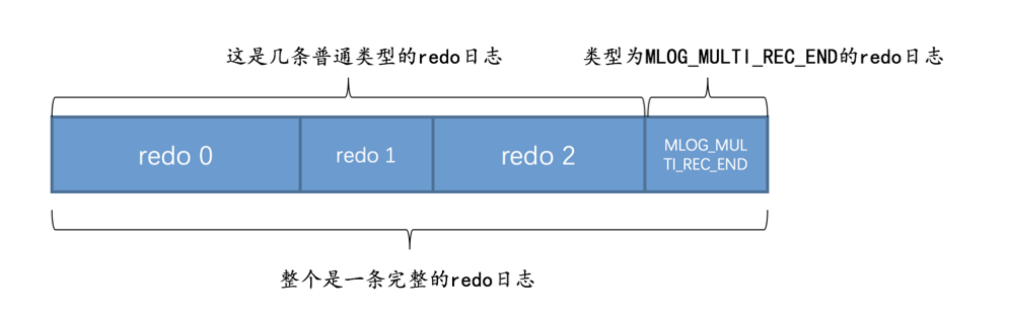 所以某个需要保证原子性的操作产生的一系列 redo 日志必须要以一个类型为 MLOG_MULTI_REC_END 结尾,就像这样: