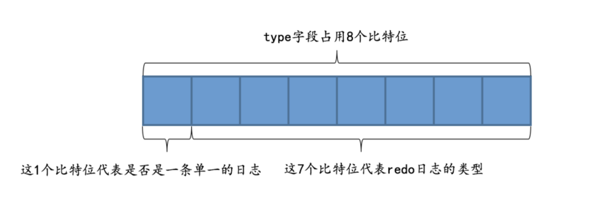 其实在一条日志后边跟一个类型为 MLOG_MULTI_REC_END 的 redo 日志也是可以的,不过设计 InnoDB 的大叔比较勤俭节约,他们不想浪费一个比特位。别忘了虽然 redo 日志的类型比较多,但撑死了也就是几十种,是小于 127 这个数字的,也就是说我们用7个比特位就足以包括所有的 redo 日志类型,而 type 字段其实是占用1个字节的,也就是说我们可以省出来一个比特位用来表示该需要保证原子性的操作只产生单一的一条redo 日志,示意图如下: