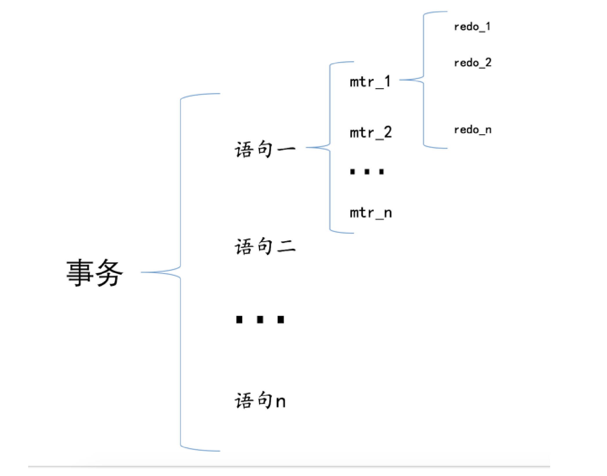 一个事务可以包含若干条语句,每一条语句其实是由若干个 mtr 组成,每一个 mtr 又可以包含若干条 redo 日志,画个图表示它们的关系就是这样: