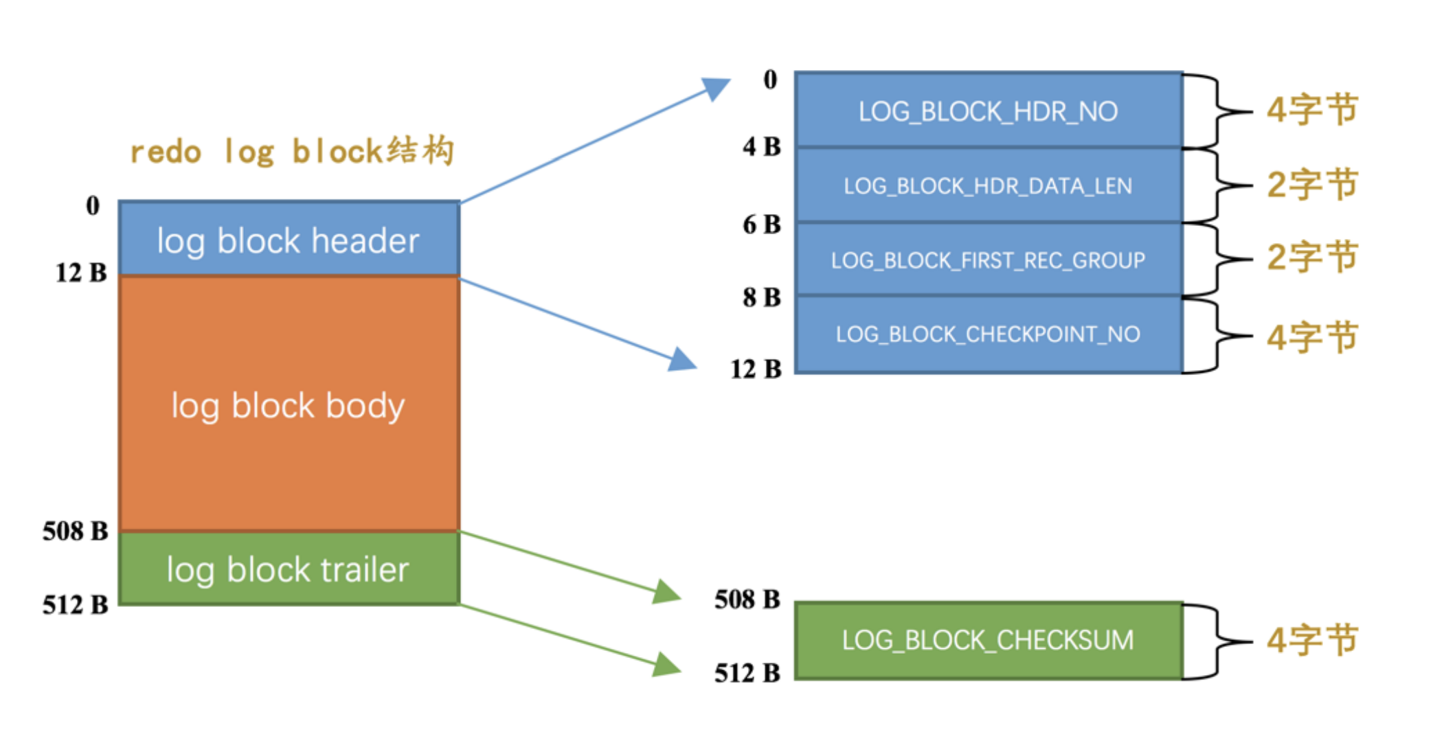 - LOG_BLOCK_CHECKPOINT_NO :表示所谓的 checkpoint 的序号, checkpoint 是我们后续内容的重点,现在先不用清楚它的意思,稍安勿躁。