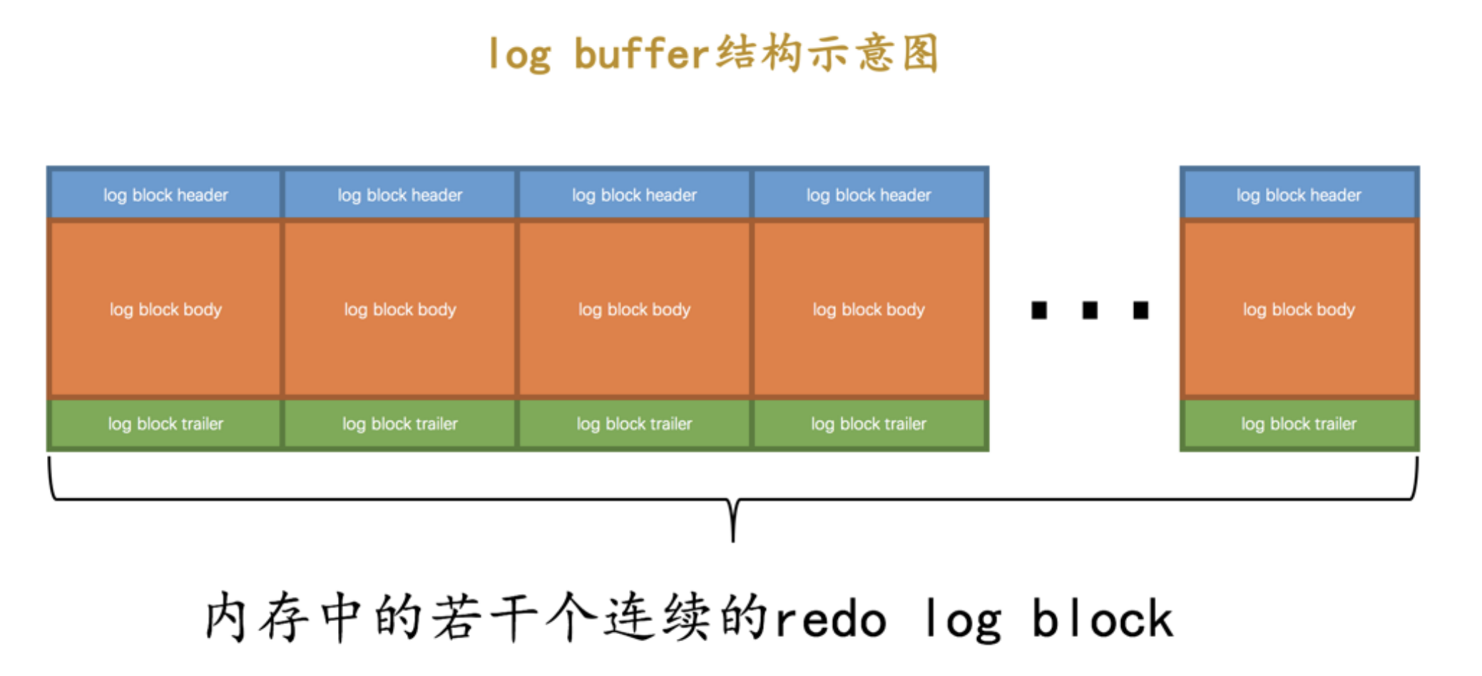 我们前边说过,设计 InnoDB 的大叔为了解决磁盘速度过慢的问题而引入了 Buffer Pool 。同理,写入 redo 日志时也不能直接直接写到磁盘上,实际上在服务器启动时就向操作系统申请了一大片称之为 redo log buffer 的连续内存空间,翻译成中文就是 redo日志缓冲区 ,我们也可以简称为 log buffer 。这片内存空间被划分成若干个连续的 redo log block ,就像这样: