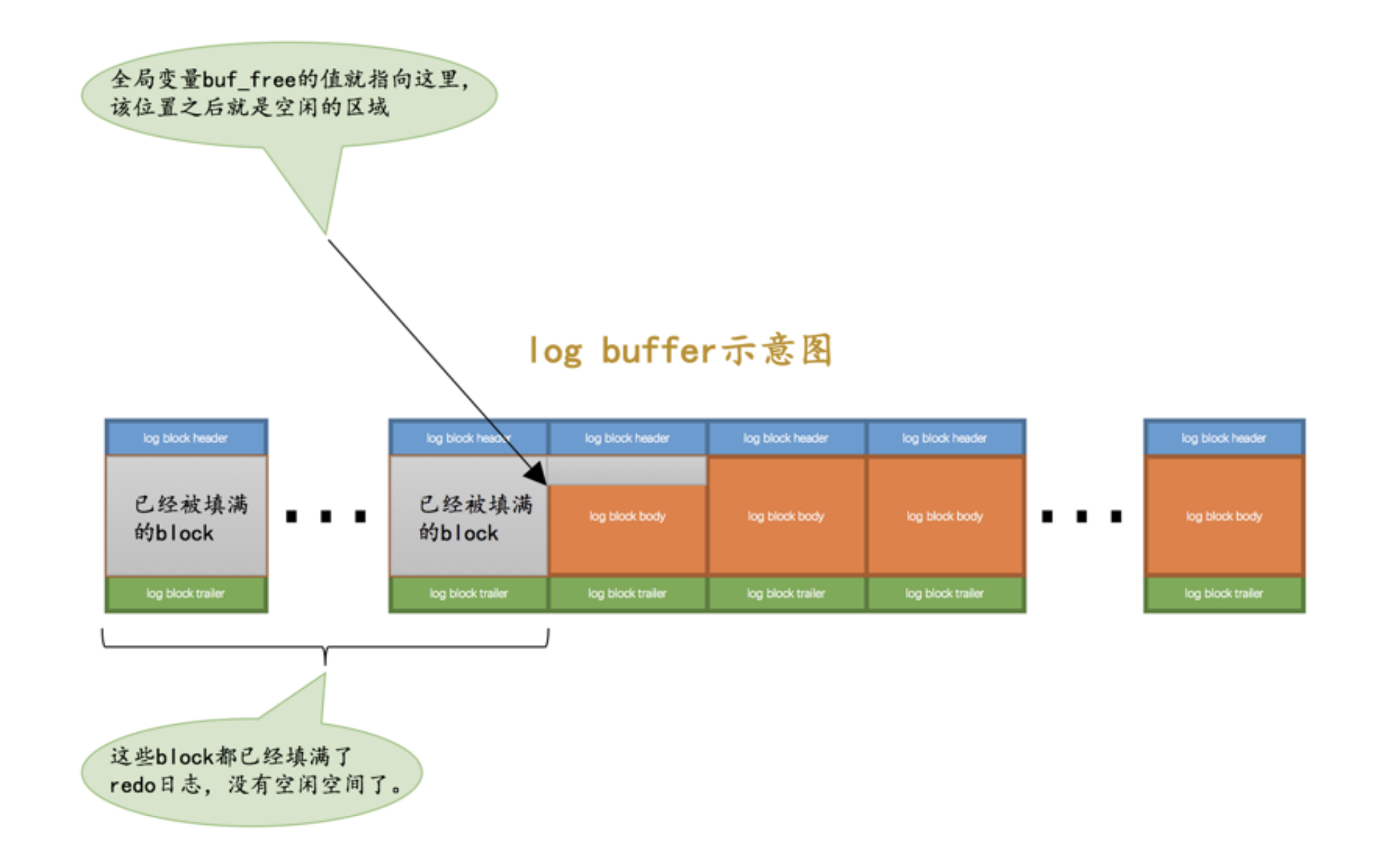 向 log buffer 中写入 redo 日志的过程是顺序的,也就是先往前边的block中写,当该block的空闲空间用完之后再往下一个block中写。当我们想往 log buffer 中写入 redo 日志时,第一个遇到的问题就是应该写在哪个block 的哪个偏移量处,所以设计 InnoDB 的大叔特意提供了一个称之为 buf_free 的全局变量,该变量指明后续写入的 redo 日志应该写入到 log buffer 中的哪个位置,如图所示: