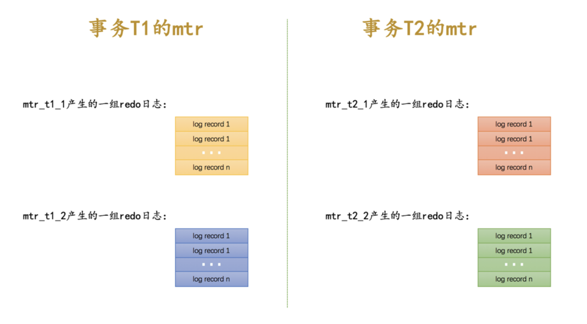 - 事务 T2 的两个 mtr 分别称为 mtr_T2_1 和 mtr_T2_2 。