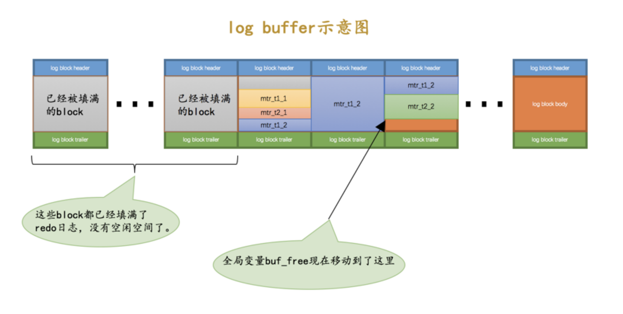 从示意图中我们可以看出来,不同的 mtr 产生的一组 redo 日志占用的存储空间可能不一样,有的 mtr 产生的 redo 日志量很少,比如 mtr_t1_1 、 mtr_t2_1 就被放到同一个block中存储,有的 mtr 产生的 redo 日志量非常大,比如 mtr_t1_2 产生的 redo 日志甚至占用了3个block来存储。