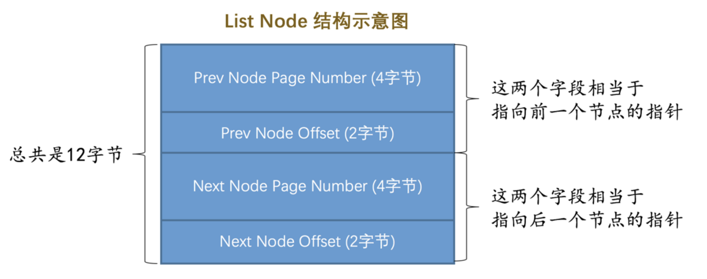 - Next Node Page Number 和 Next Node Offset 的组合就是指向后一个节点的指针。