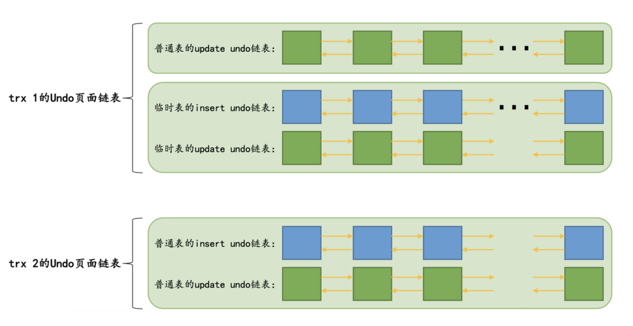 另外,设计 InnoDB 的大叔规定对普通表和临时表的记录改动时产生的 undo日志 要分别记录(我们稍后阐释为啥这么做),所以在一个事务中最多有4个以 Undo页面 为节点组成的链表: