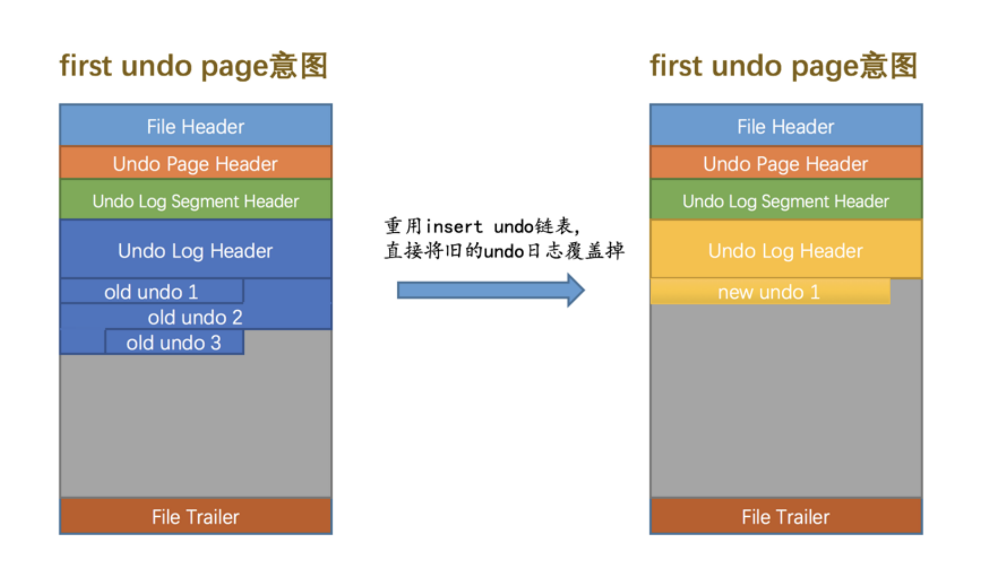我们前边说过, Undo页面 链表按照存储的 undo日志 所属的大类可以被分为 insert undo链表 和 update undo链表 两种,这两种链表在被重用时的策略也是不同的,我们分别看一下: