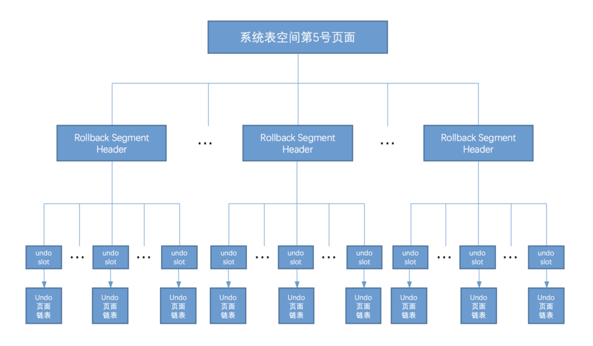 所以通过上边的叙述我们可以大致清楚,在系统表空间的第 5 号页面中存储了128个 Rollback Segment Header 页面地址,每个 Rollback Segment Header 就相当于一个回滚段。在 Rollback Segment Header 页面中,又包含 1024 个 undo slot ,每个 undo slot 都对应一个 Undo页面 链表。我们画个示意图:把图一画出来就清爽多了。