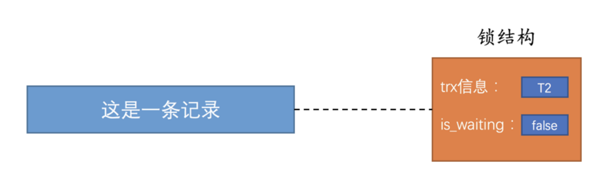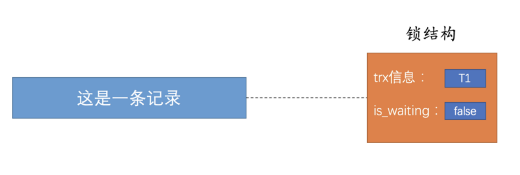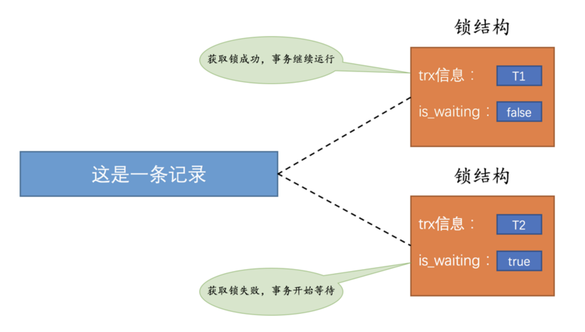在事务 T1 提交之前,另一个事务 T2 也想对该记录做改动,那么先去看看有没有 锁结构 与这条记录关联,发现有一个 锁结构 与之关联后,然后也生成了一个 锁结构 与这条记录关联,不过 锁结构 的is_waiting 属性值为 true ,表示当前事务需要等待,我们把这个场景就称之为获取锁失败,或者加锁失败,或者没有成功的获取到锁,画个图表示就是这样: