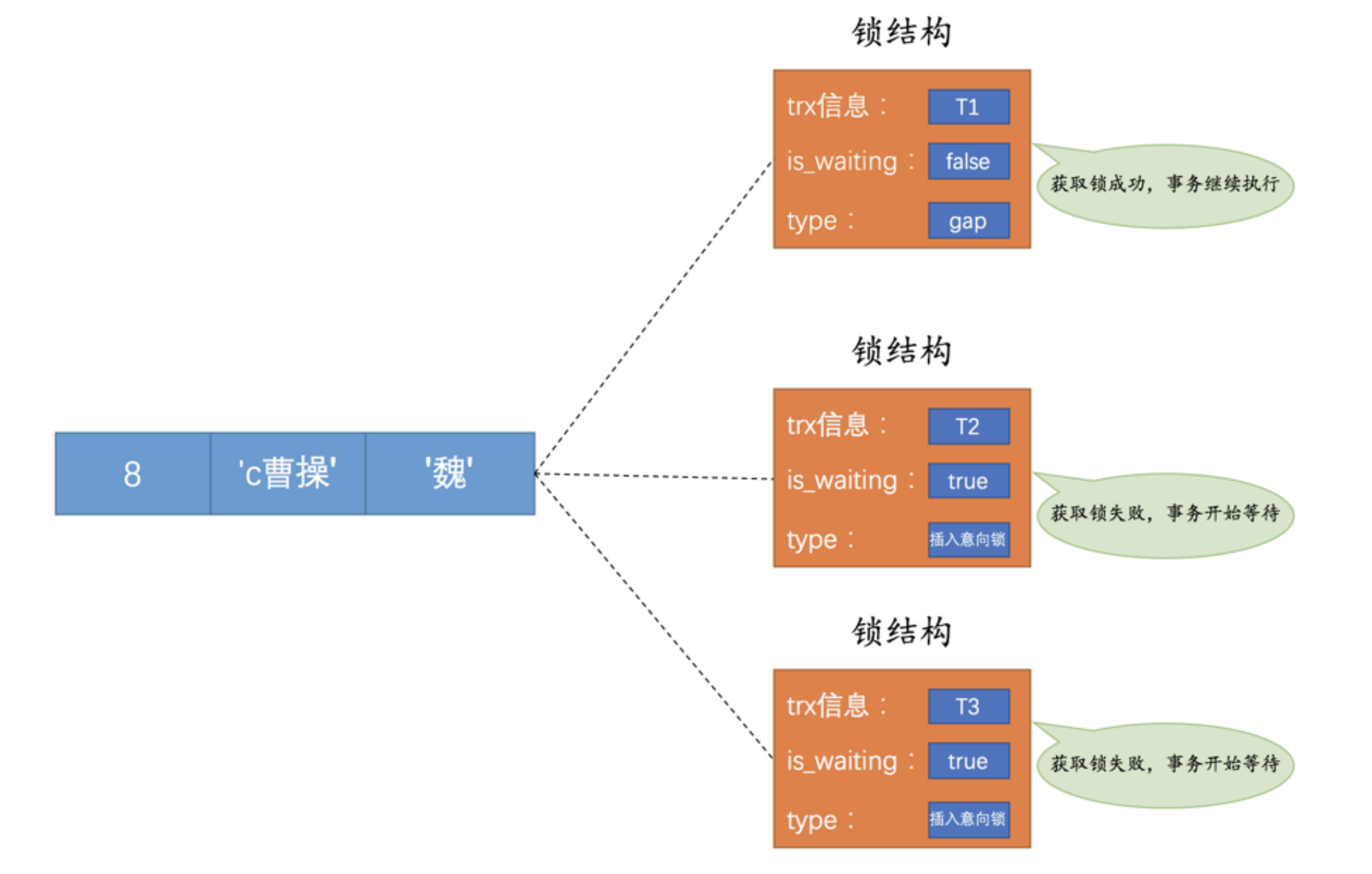 意思就是在内存中生成了对应的 锁结构 ,而且锁结构的 is_waiting 属性为 false ,也就是事务可以继续执行操作。