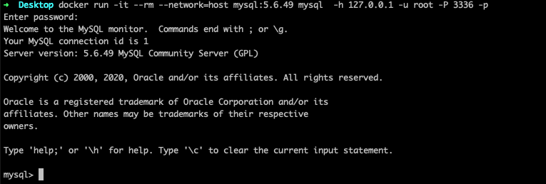 # 使用mysql容器内部客户端进行访问 # [需要注意的是,让当前测试容器和宿主机共用一个网络栈。目的就是让 127.0.0.1 变成宿主机的ip,而不是docker容器内部的。] # [-e LANG="C.UTF-8" 指定当前操作系统可以支持的字符集,确保可以输入中文。有无双引号都可以,] # [(en_US.UTF-8是不可以的)。] # [ 还需要注意必须在mysql连接命令之前执行。不然的话,mysql是识别不到的。] $ docker run -it --rm --network=host -e LANG="C.UTF-8" mysql:5.6.49 mysql -h 127.0.0.1 -u root -P 3336 -p