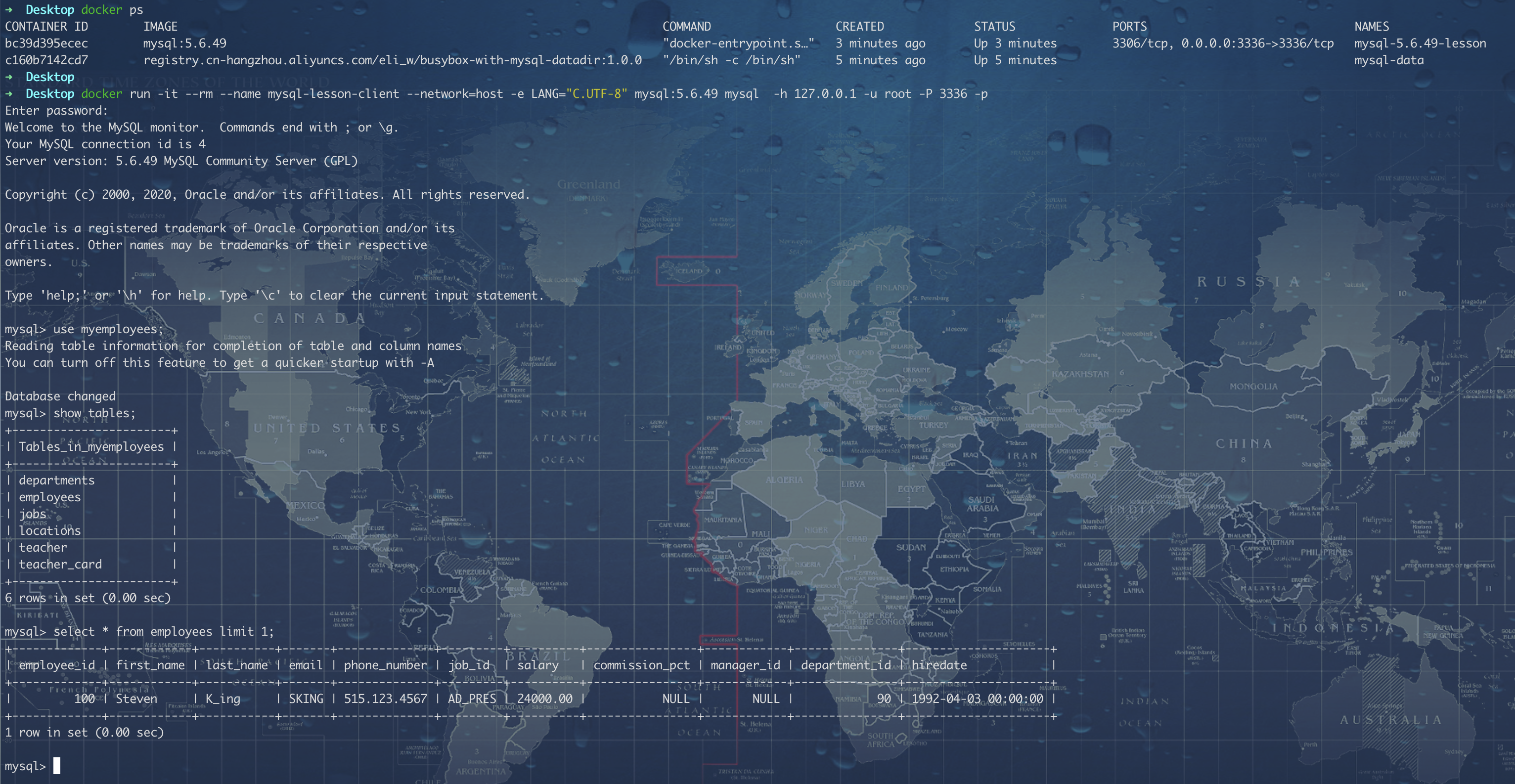 3). 使用客户端连接测试docker run -it --rm --name mysql-lesson-client --network=host -e LANG="C.UTF-8" mysql:5.6.49 mysql -h 127.0.0.1 -u root -P 3336 -p