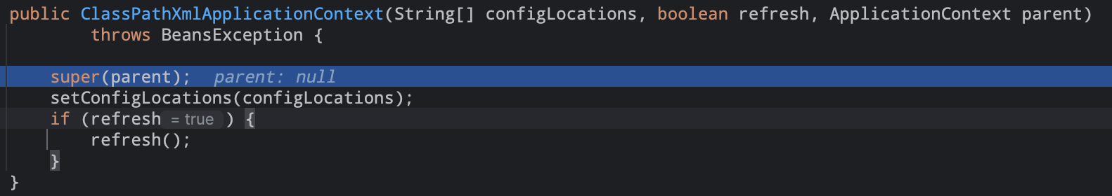 在this()内部获取一个PathMatchingResourcePatternResolver().3).然后是设置配置文件位置setConfigLocations(configLocations);,对于每一个配置文件,都会通过getEnvironment()获取环境变量StandardEnvironment对象解决(配置文件)配置文件路径中的占位符。4).接下来进入主题AbstractApplicationContext#refresh();