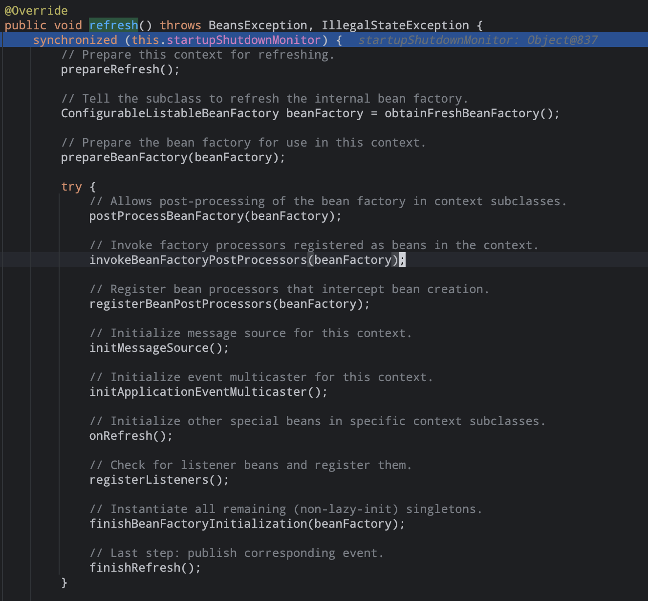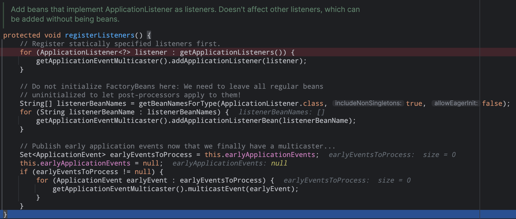 注册监听器,包括(静态自定的监听器|实现ApplicationListener类型的bean监听器),目前数量为0,然后通过多播器发布之前收集的事件。11). finishBeanFactoryInitialization(beanFactory) #