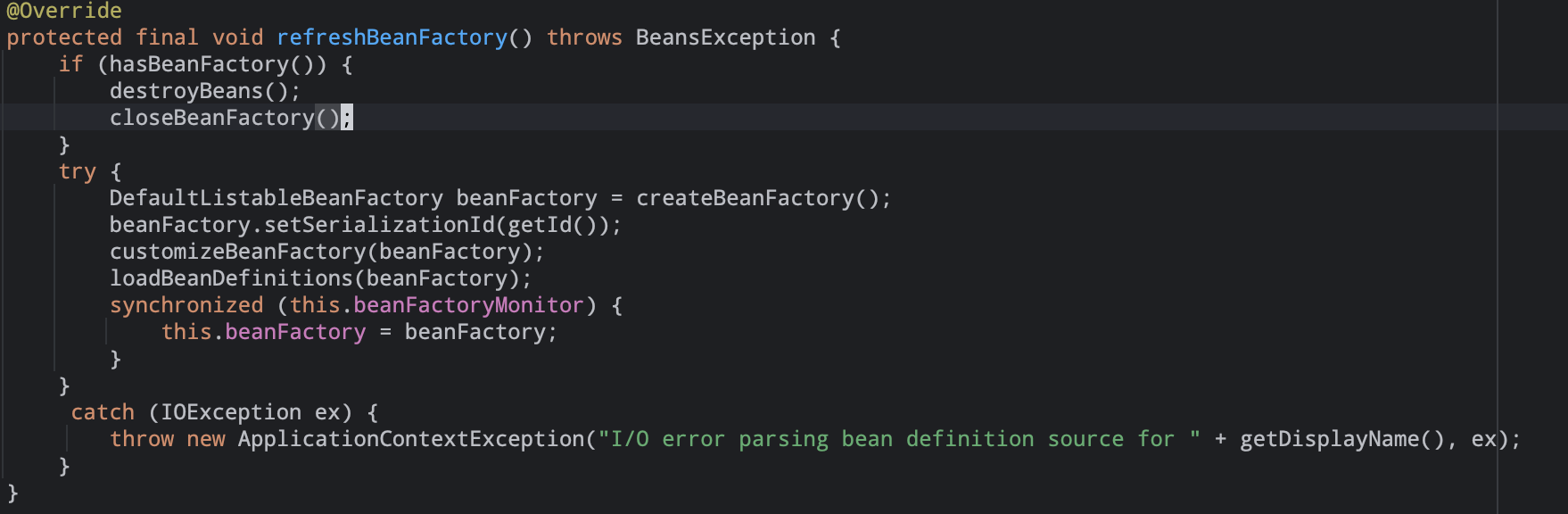获取一个新的bean工厂。protected abstract void refreshBeanFactory() throws BeansException, IllegalStateException;由子类去处理。