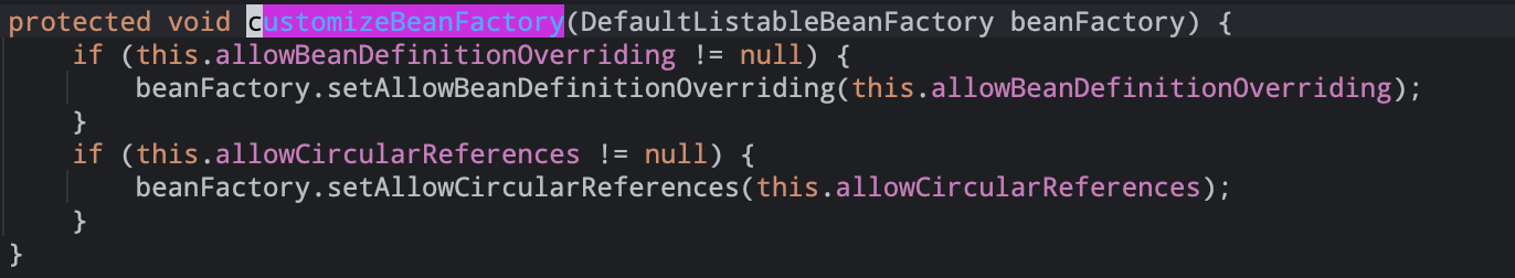 通过createBeanFactory()方法new一个 DefaultListableBeanFactory bean工厂customizeBeanFactory(beanFactory);根据需要设置bean定义覆盖和循环引用的标志。