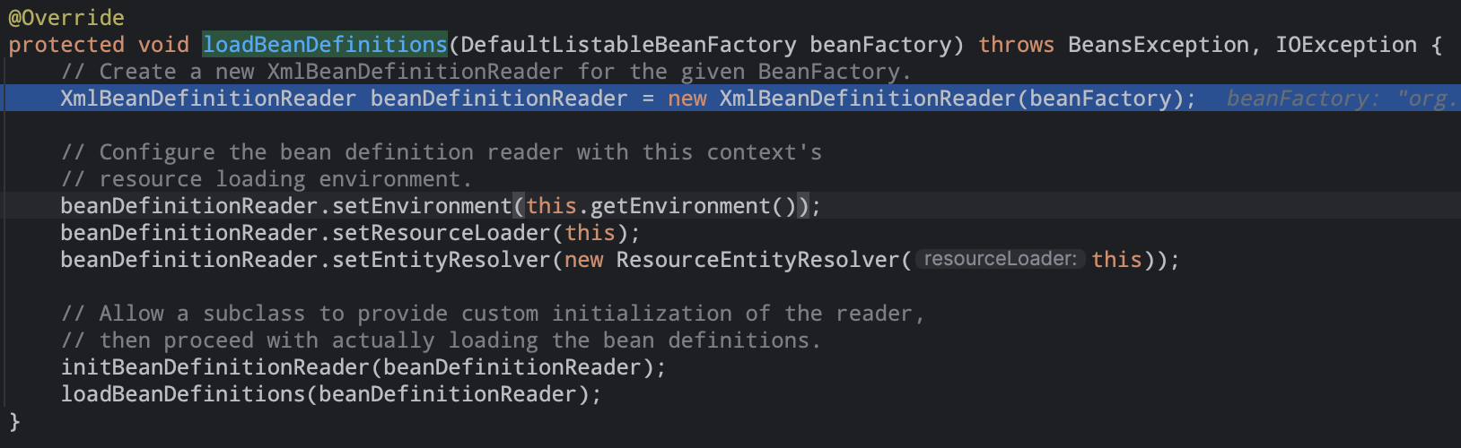 loadBeanDefinitions(beanFactory);加载bean定义,是抽象类AbstractRefreshableApplicationContext中定义的方法,由子类AbstractXmlApplicationContext去实现。