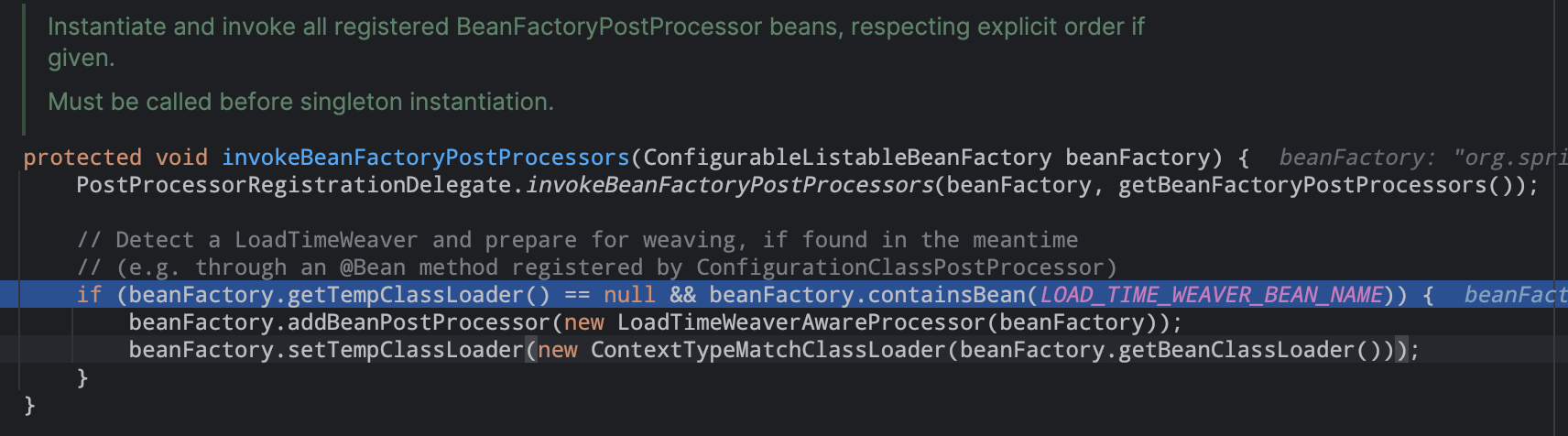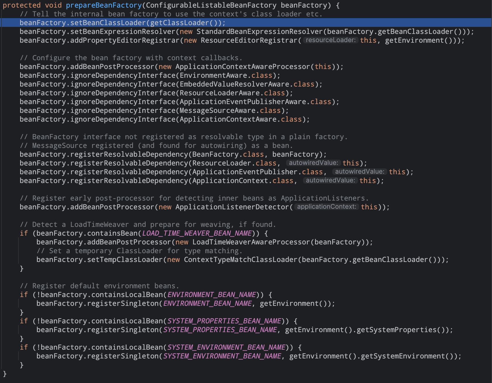 准备/配置beanfactory为接下来的使用,配置一些标准的特性,比如上下文加载器和后置处理器。1).增加两个默认的bean后置处理器ApplicationContextAwareProcessor,ApplicationListenerDetector。2).其中的resolvableDependency用来注册一些默认类型的对象。例如有ApplicationContext类型的注入,当在population的时候通过findAutowireCandidates()方法中就可以使用到刚才默认的这些值了。04). postProcessBeanFactory(beanFactory) #