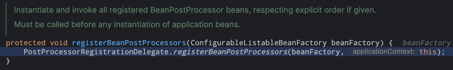 调用beanfactory的后置处理器。当前上下文通过getBeanFactoryPostProcessors()获取到为0,所以忽略。但是mvc或者boot就不会为0了。06). registerBeanPostProcessors(beanFactory) #