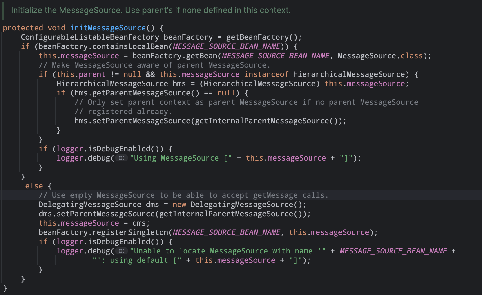 注册bean的后置处理器。当前上下文也为0,所以忽略。07). initMessageSource() #