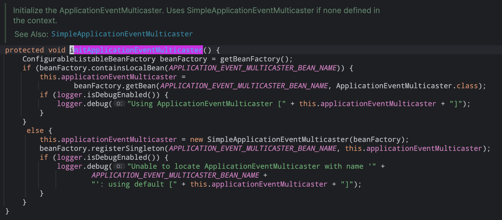 主要用来消息国际化,此处会实例化一个叫MessageSource类型的bean对象(如果配置的话)。 【demo参考】08). initApplicationEventMulticaster() #