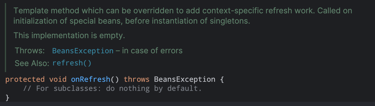 和上面的国际化差不多,默认给容器中注册一个事件多播器ApplicationEventMulticaster。在如下的10.registerListeners()中进行配置注册09). onRefresh() #