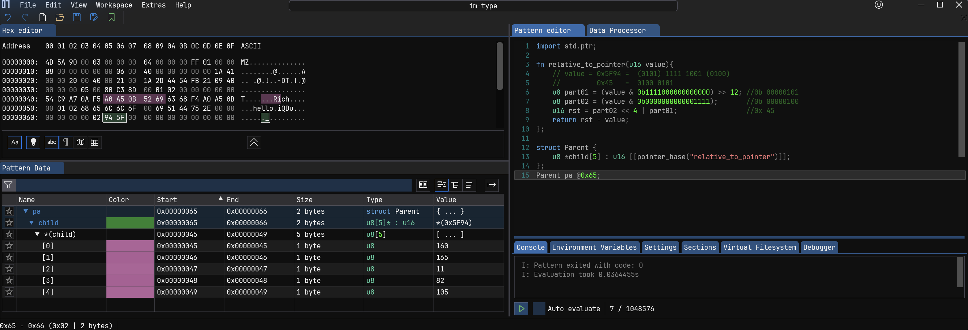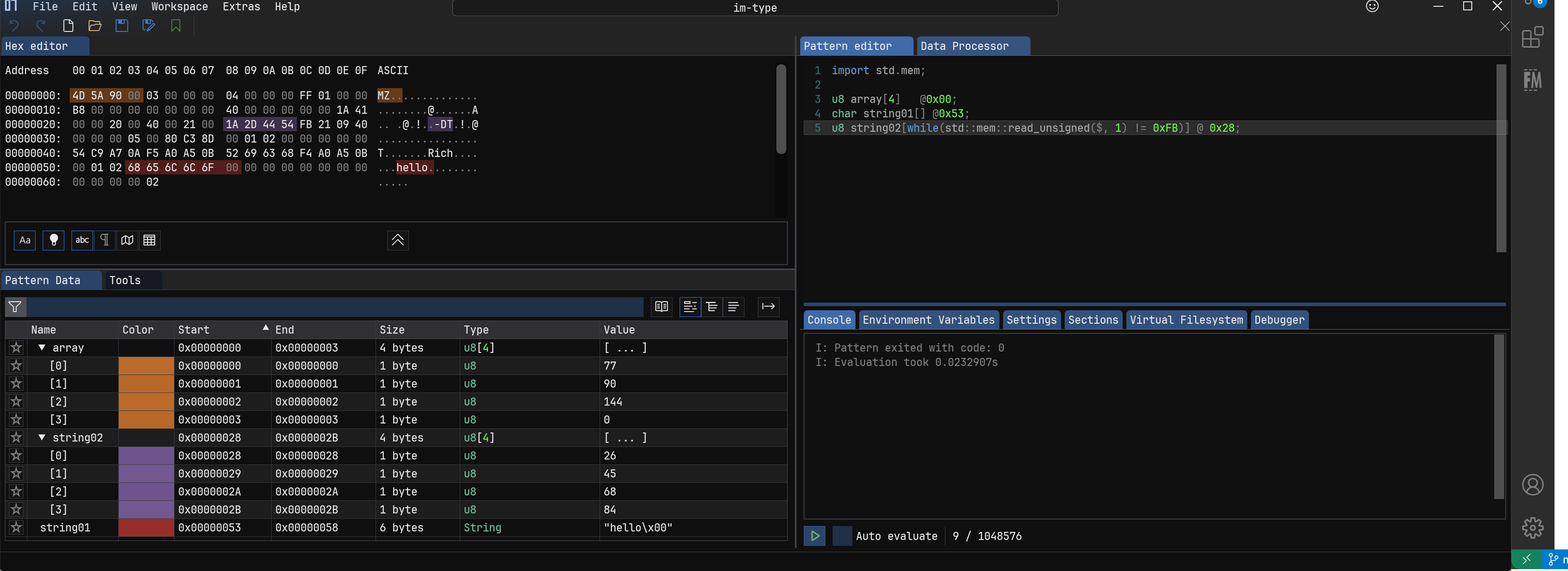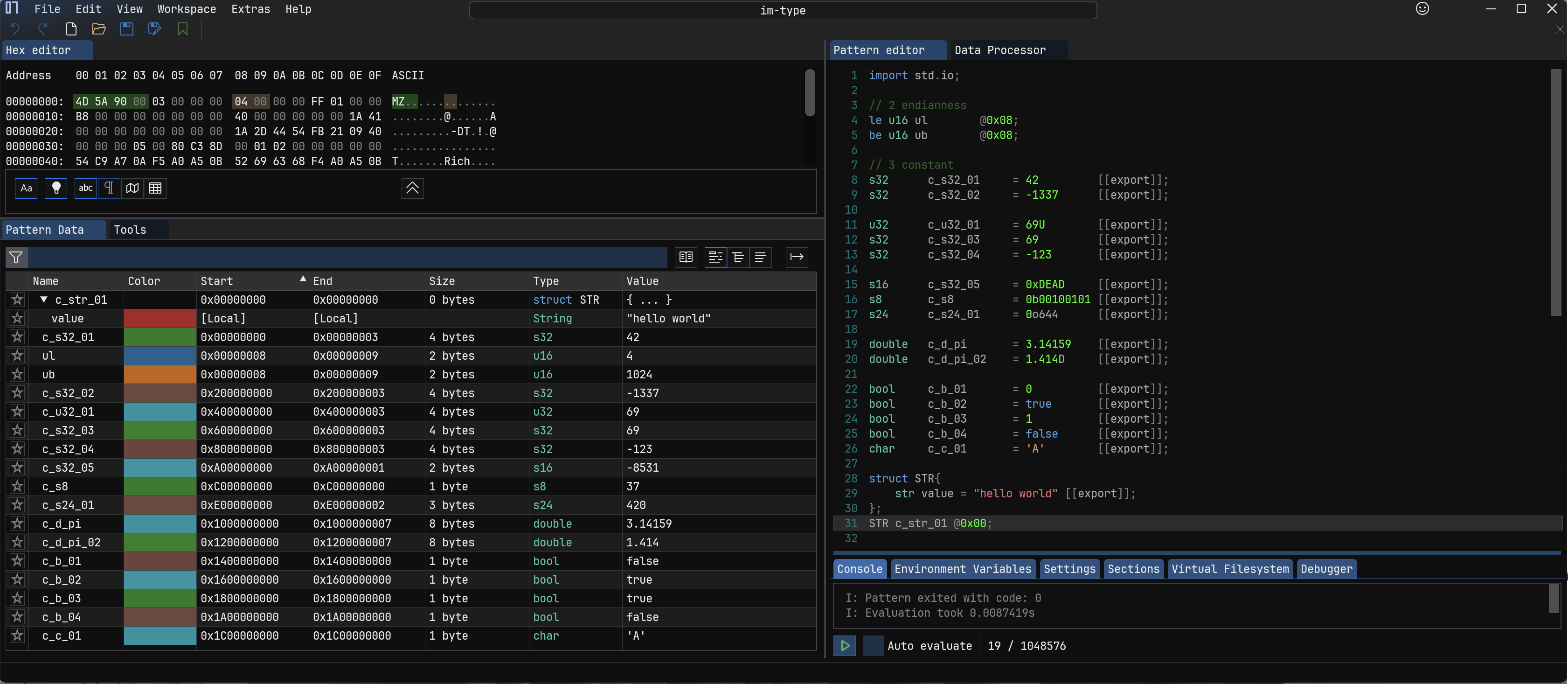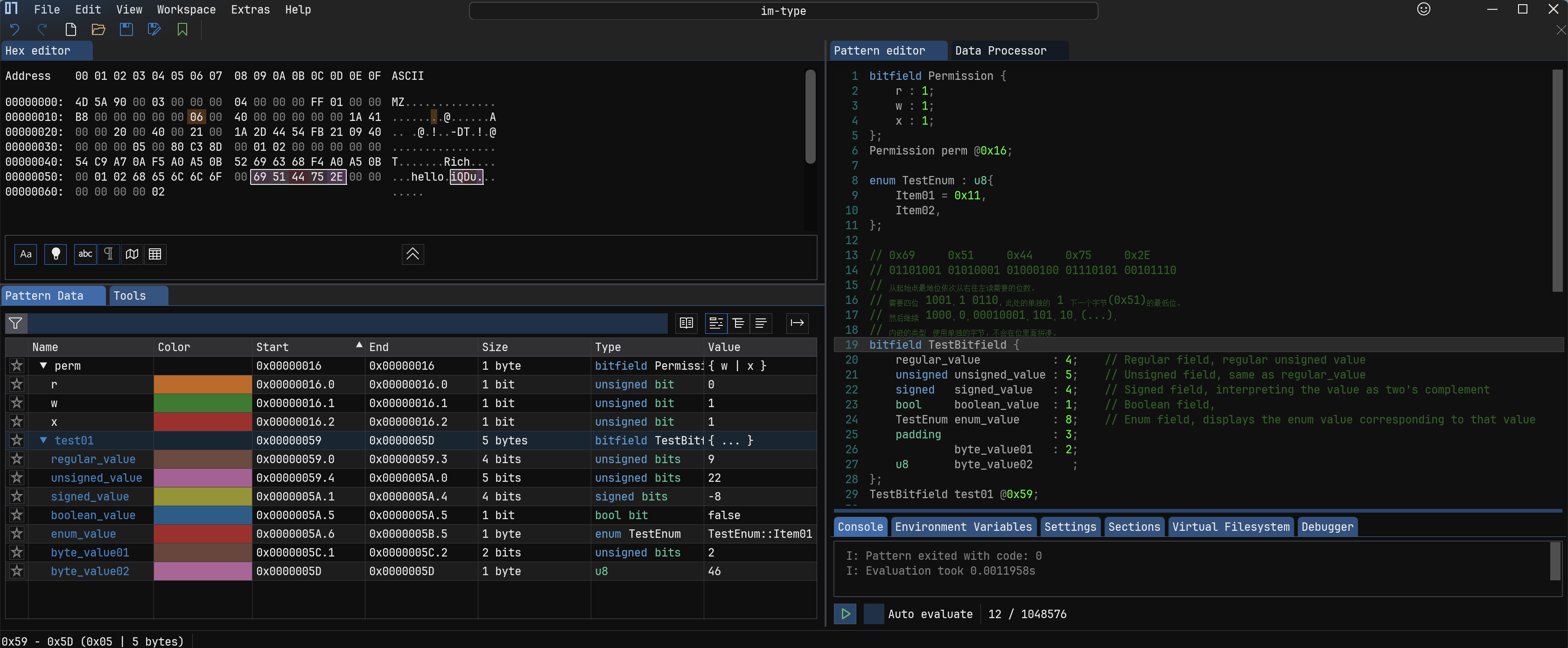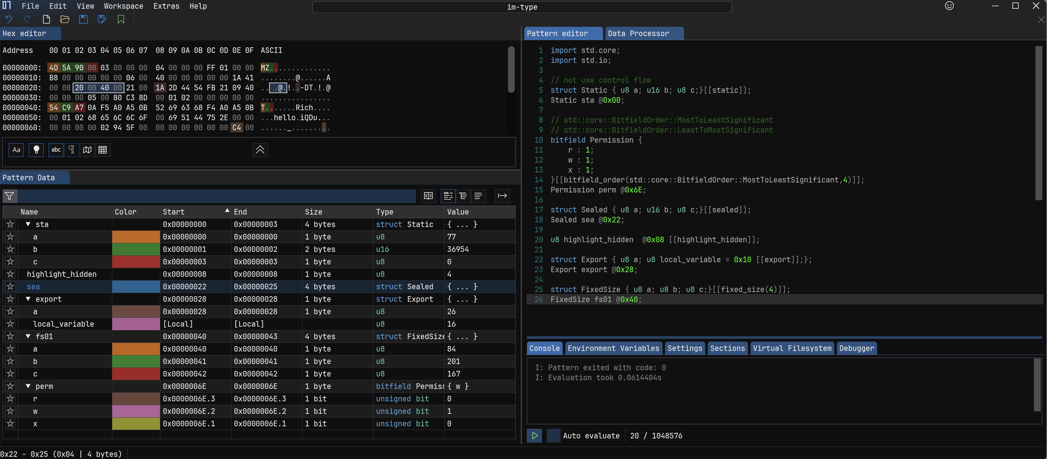 ImHex 的精髓所在。简单的理解,就是通过模式编辑器(Pattern editor),通过编程的方式将二进制文件按照内存地址解析成对应的模式(变量),并通过 Pattern Data 视图窗口将数据展示出来,可以自定义展示数据格式,颜色等,数据布局,格式分布一目了然。类比于 Java POJO中的 toString()。 参考文档
