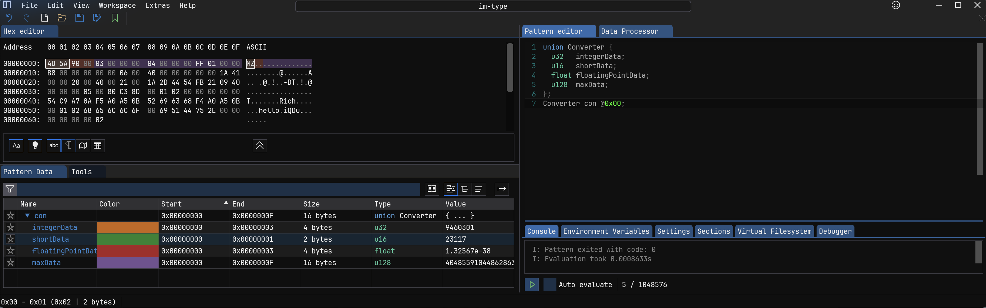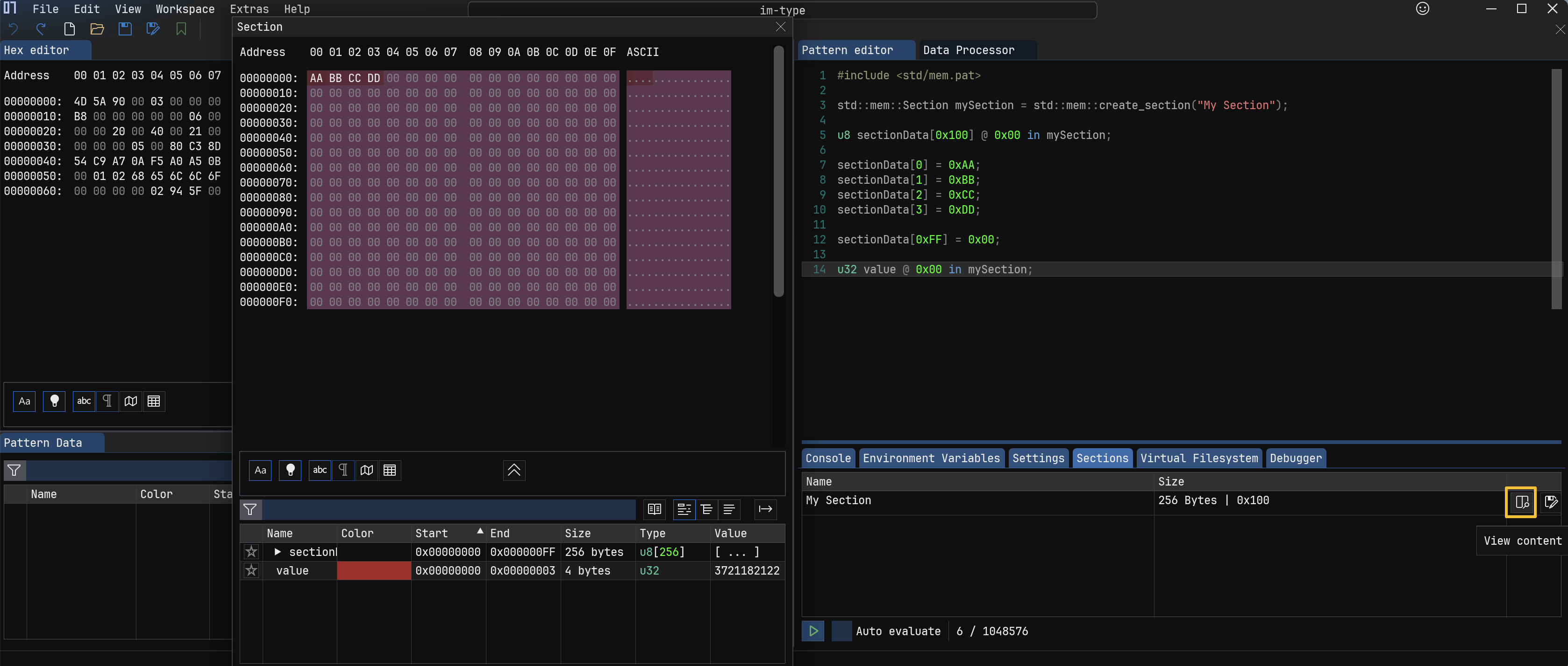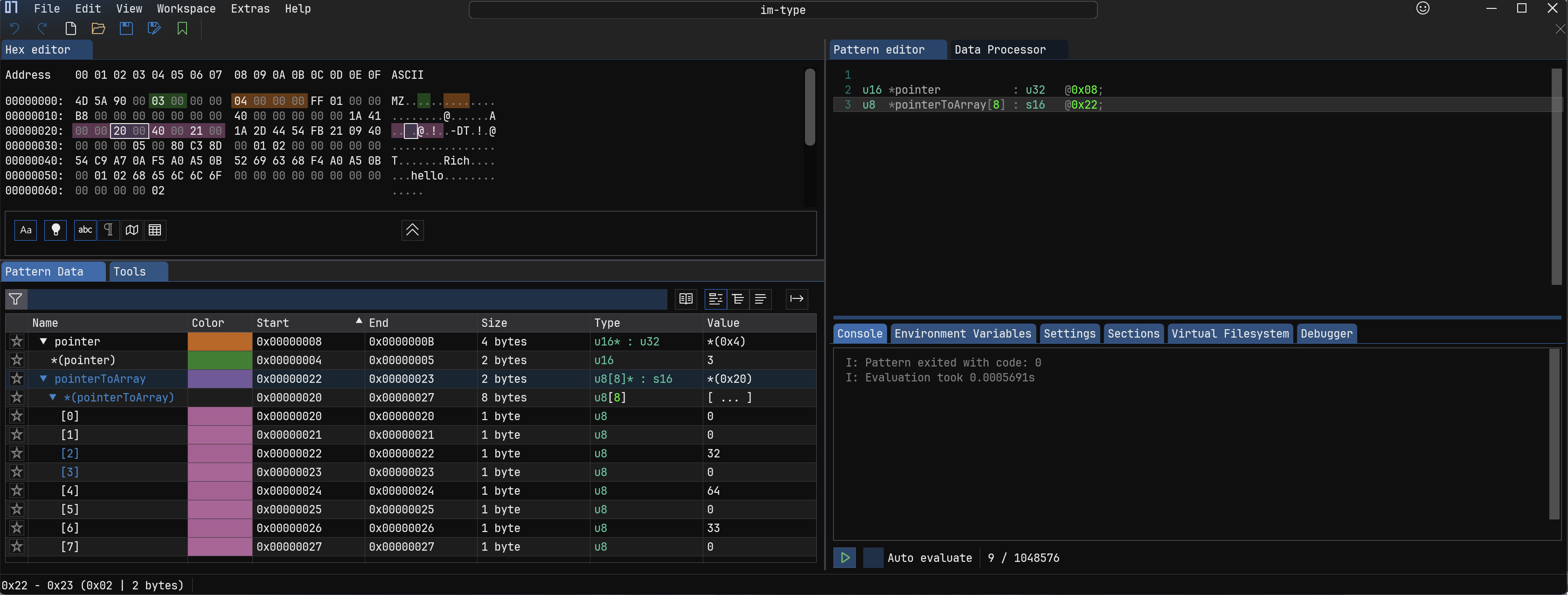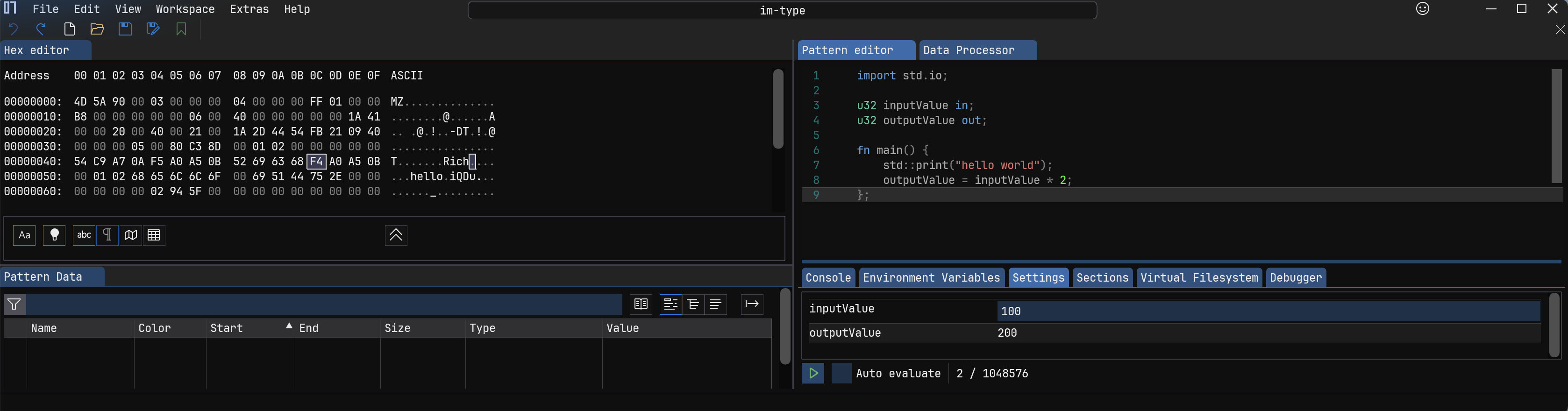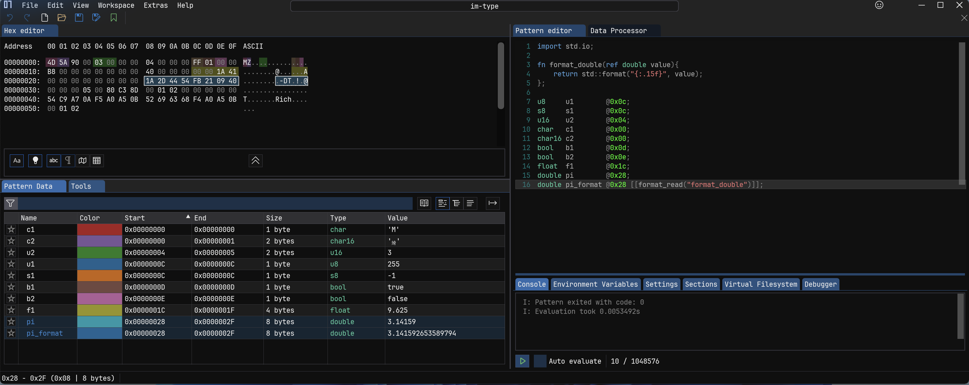 ImHex 的精髓所在。简单的理解,就是通过模式编辑器(Pattern editor),通过编程的方式将二进制文件按照内存地址解析成对应的模式(变量),并通过 Pattern Data 视图窗口将数据展示出来,可以自定义展示数据格式,颜色等,数据布局,格式分布一目了然。类比于 Java POJO中的 toString()。 参考文档
